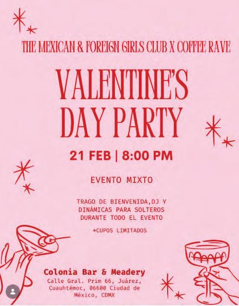 l M&F Girls Club y Co ee Rave México organizaron una fiesta de San Valentín para conocer personas, hacer nuevas amistades o ir a disfrutar con tus amigos. Este plan es para todos, la dinámica es mixta y contará con Dj y tragos de bienvenida. El 21 de febrero, 20:00 horas.