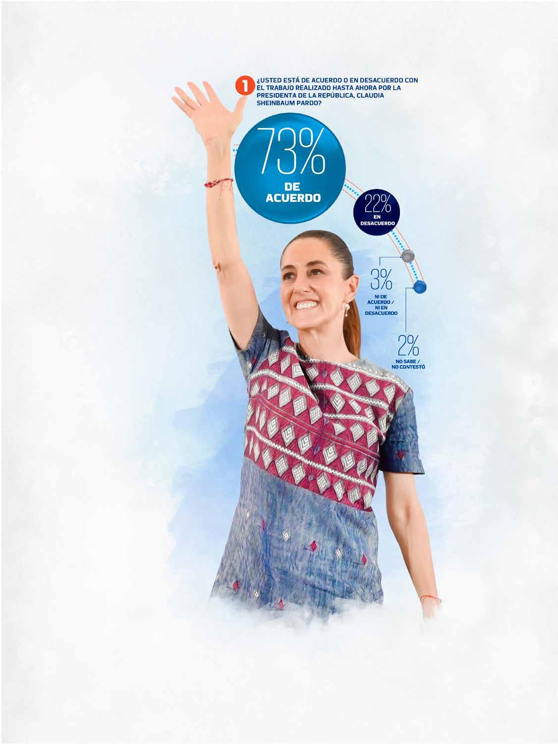 A la pregunta: “¿Usted está de acuerdo o en desacuerdo con el trabajo realizado hasta ahora por la presidenta de la República, Claudia Sheinbaum Pardo?”, 73% de los consultados respondió que “de acuerdo”; 22% se pronunció “en desacuerdo”; 3%, “ni de acuerdo ni en desacuerdo”; y 2%, “no sabe/ no contestó”.