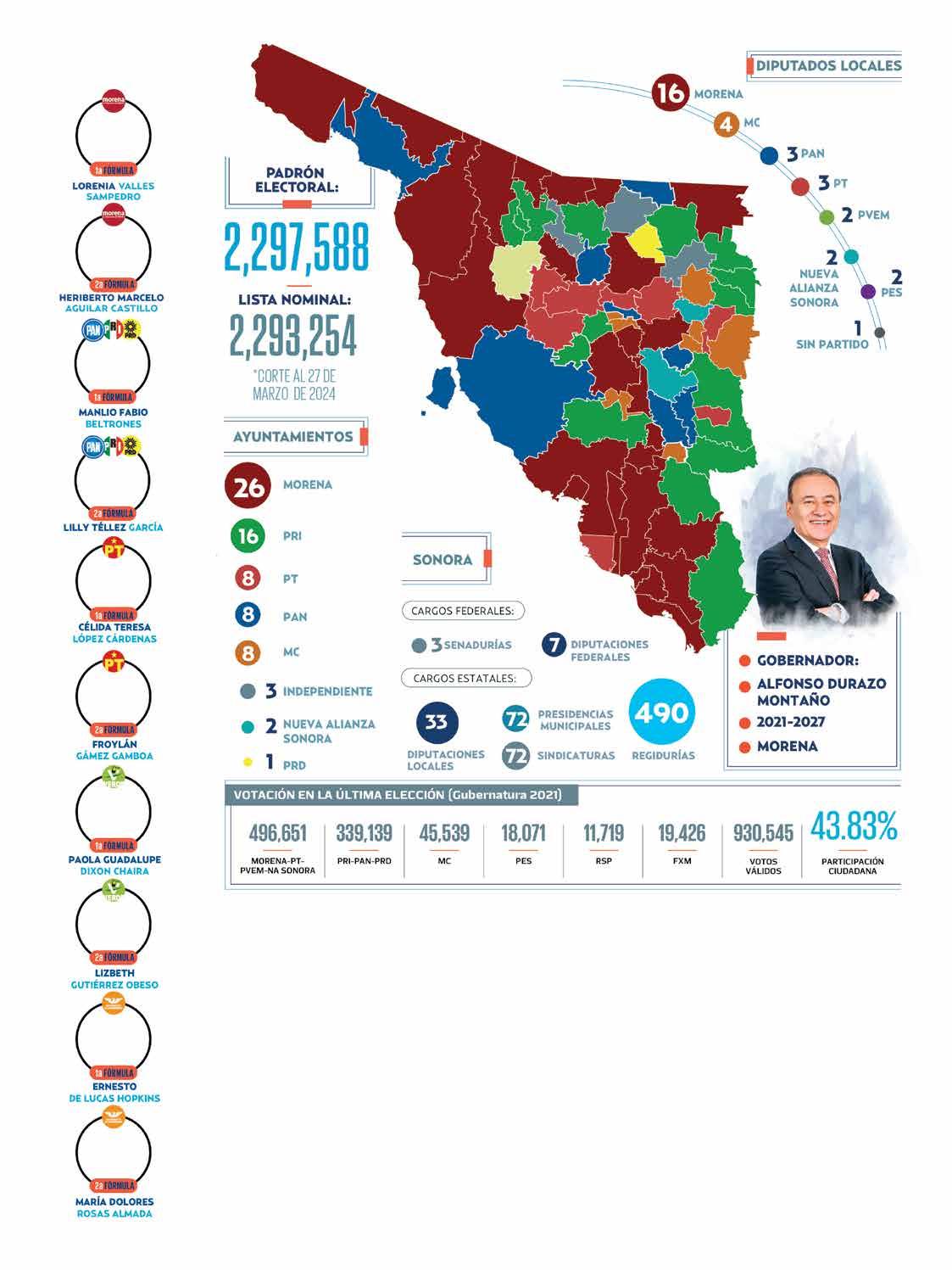 Sonora es gobernada por Alfonso Durazo Montaño, de Morena, quien junto con el árbitro electoral estatal tienen el reto de realizar una jornada en paz y sin contratiempos, toda vez que hay un Padrón Electoral de dos millones 297 mil 588 personas. La Lista Nominal la integran dos millones 293 mil 254 ciudadanos