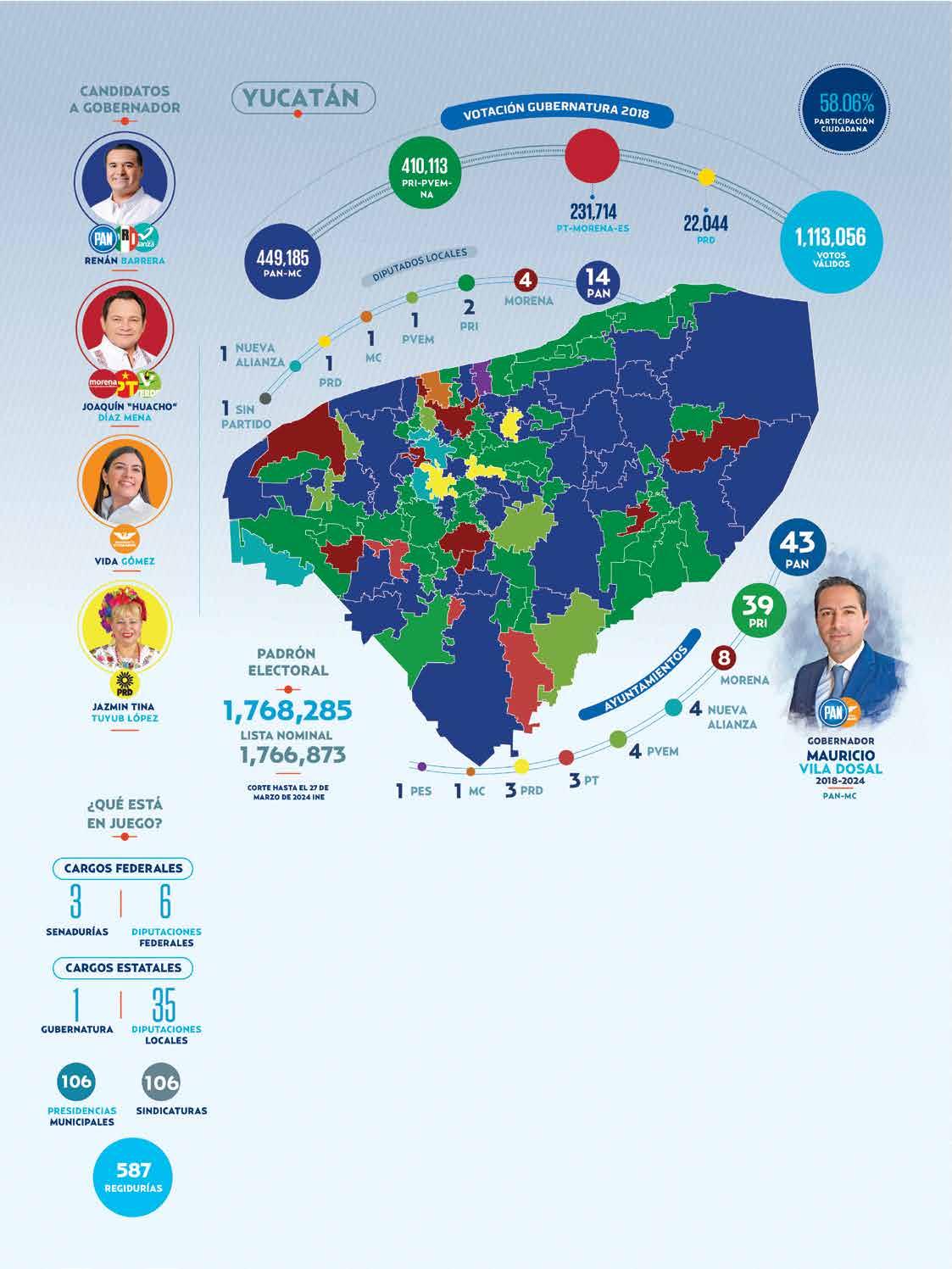 Yucatán está pintado de azul, pues además de que el mandatario Mauricio Vila Dosal es panista, Acción Nacional gobierna en 43 de los 106 municipios y en la Legislatura local, tiene 14 de 25 curules.