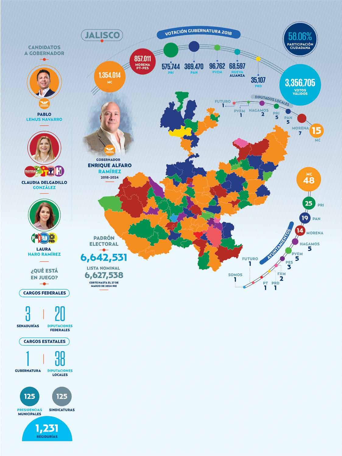A nivel federal disputan tres senadurías y seis diputaciones. En lo local, además del gobierno, elegirán 35 diputados, cambiarán 106 presidencias municipales, así como 106 sindicaturas y 587 regidurías.
