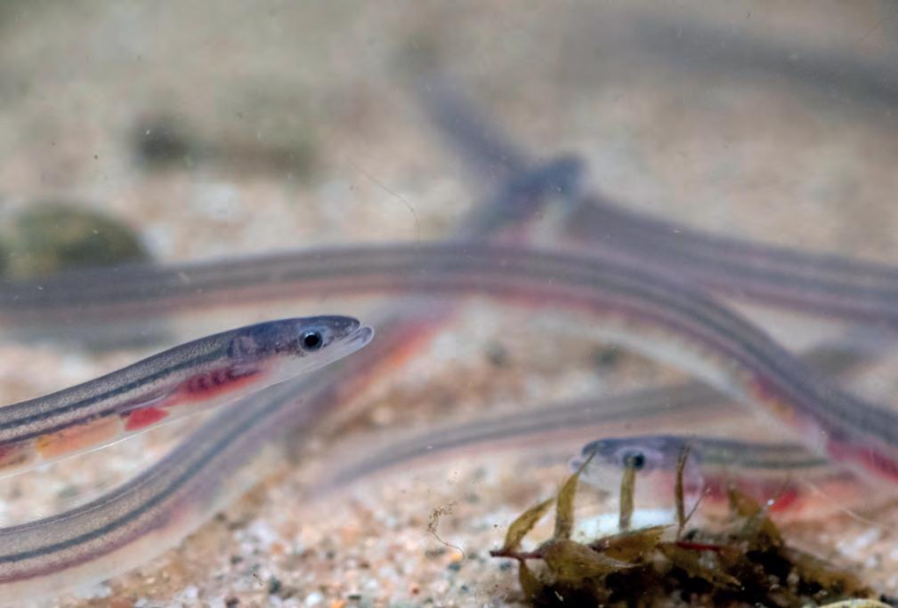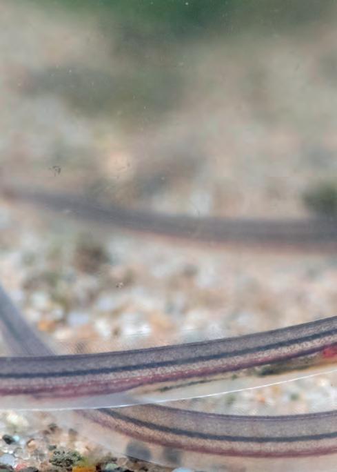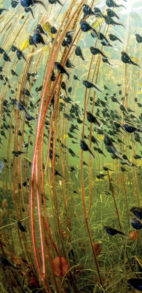 Igebelarren azpian zapaburu-saldo bat dabil igerian, hondoko harrapariengandik ihesi, azaleko uretara iritsi nahian, han elikatzeko.