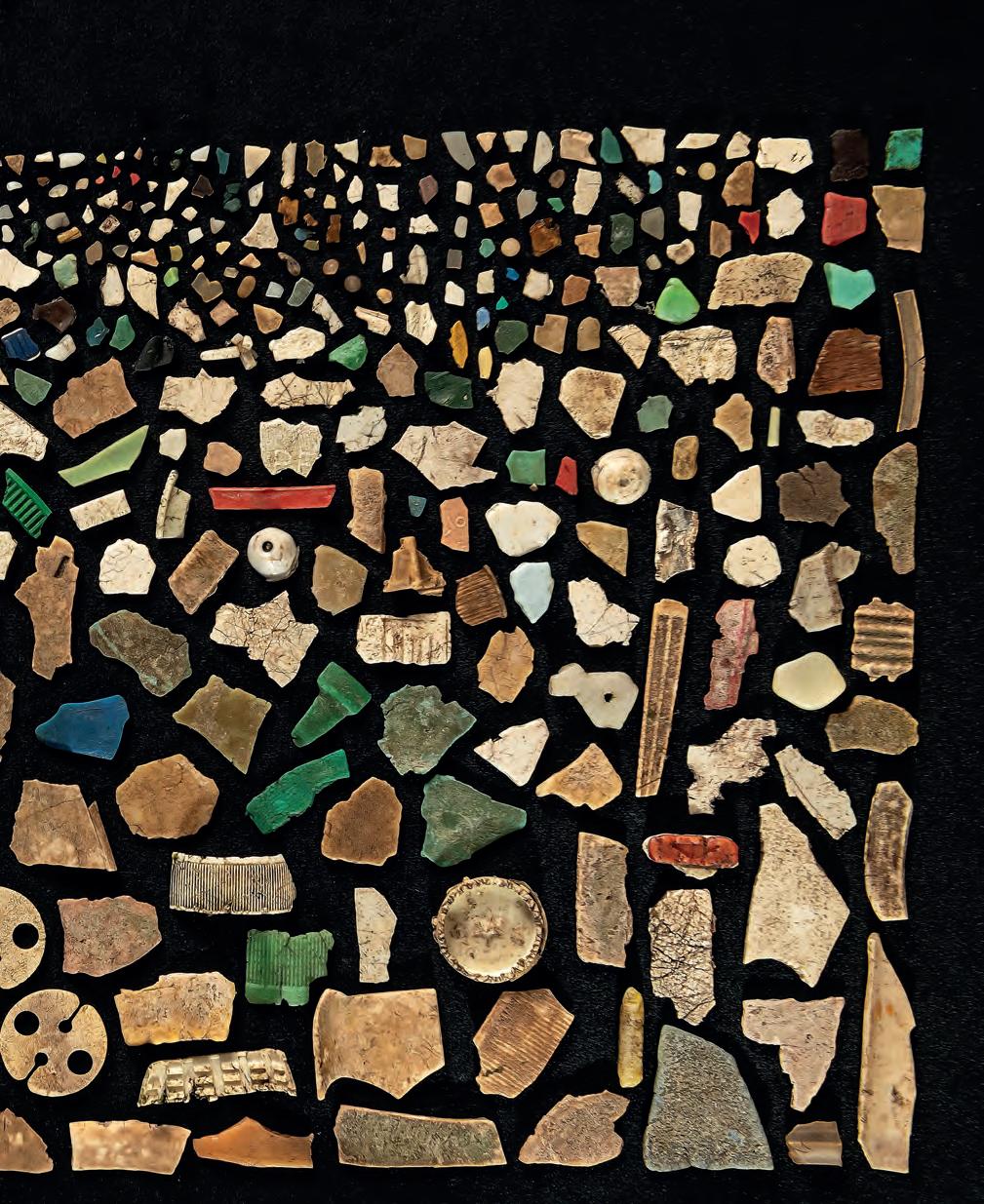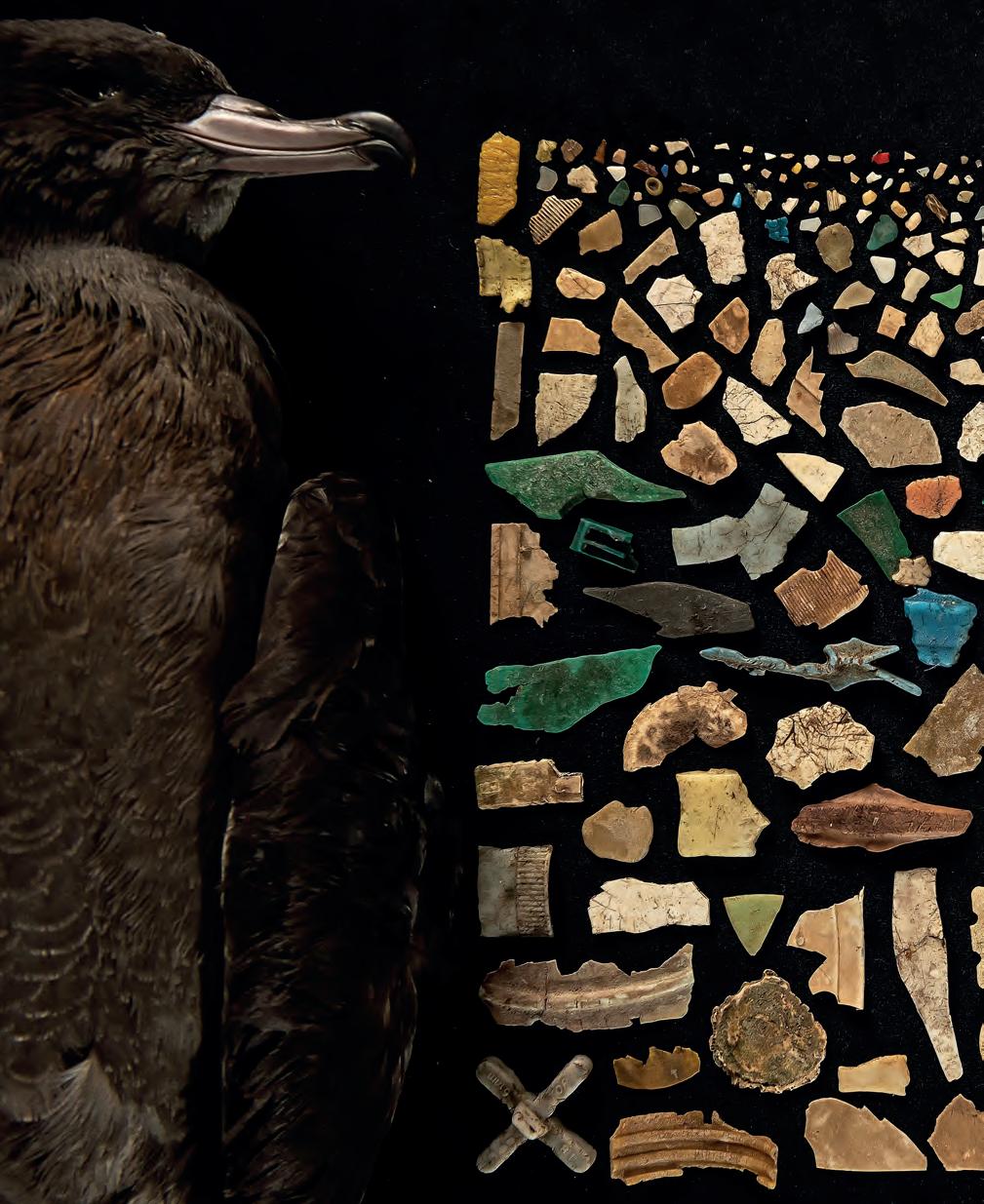 Hildako itsas hegazti baten (Ardenna carneipes) digestio-hoditik ateratako plastikozko 403 piezarekin egin zuen mosaiko hau Justin Gilliganek.