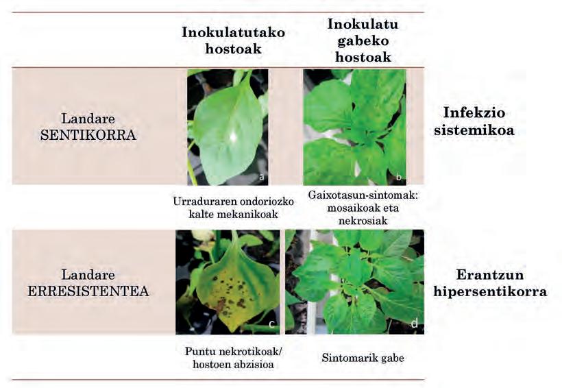 3. irudia. Barietate sentikor eta erresistenteetan tobamobirusak inokulatzean agertzen diren sintoma nagusiak. Landare sentikorretan inokulatutako hostoetan, ez da sintomarik, baina inokulatu gabeko hostoetan gaixotasun-sintomak ikus daitezke. Landare erresistenteetan inokulatutako hostoetan, puntu nekrotikoak eta abzisioa azaltzen dira, eta inokulatu gabeko hostoetan landarea osasuntsu ikusten da. ARG.: NEIKER.