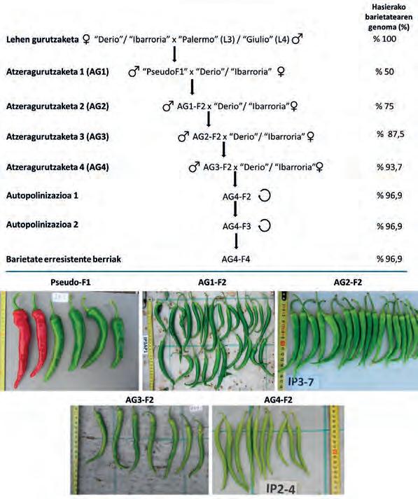 4. irudia. Gernikako piperrean eta Ibarrako piperminean tobamobirusekiko erresistenteak diren barietateak lortzeko, markatzaile molekularrekin lagundutako atzeragurutzaketen (AG) bidez gauzatutako hobekuntzaprogramaren eskema. Hobekuntza genetikoko programa hau 7 belaunaldiz osatuta egon zen: PseudoF1 (bertako barietate sentikorren eta italiar barietateko hibrido erresistenteen arteko gurutzaketa bidez), 4 atzeragurutzatze eta 2 autopolinizazio. “Derio” eta “Ibarroria” barietate sentikorrak “Palermo” eta “Giulio” barietate heterozigoto erresistenteekin gurutzatuz, lau hobekuntza-material desberdin lortu ziren: Ibarrako pipermina L3 genearekin, Ibarrako pipermina L4 genearekin, Gernikako piperra L3 genearekin eta Gernikako piperra L4 genearekin. Beheko aldean ikusten da nola berreskuratu genituen 4 atzeragurutzaketa eginda Ibarrako piparraren ezaugarri morfologikoak. ARG.: NEIKER.