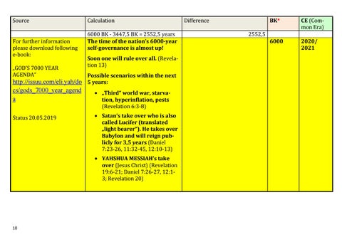 Calculation 6000 BK - 3447,5 BK = 2552,5 years The time of the nation’s 6000-year self-governance is almost up! Soon one will rule over all. (Revelation 13)