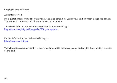 Copyright 2015 by Author All rights reserved Bible quotations are from “The Authorized 1611 King James Bible”, Cambridge Edition which is in public domain. Text and word emphases and editing are made by the Author. The e-book » GOD’S 7000 YEAR AGENDA « can be downloaded e.g. at http://issuu.com/eli.yah/docs/gods_7000_year_agenda