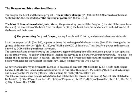 The Dragon and his authorized Beasts The dragon, the beast and the false prophet – "the mystery of iniquity" (2.Thess 2:7-12) form a blasphemous “Anti-Trinity”, the counterfeit of "the mystery of godliness" (1.Tim 3:16). The book of Revelation colorfully narrates a) the persecuting power of the Dragon, b) the rise of the beast from the sea, c) the ascension of the beast from the abyss or pit, d) the beast from the land or earth and e) downfall of the beasts and their brood. a) The persecuting fiery red Dragon, having 7 heads and 10 horns, and seven diadems on his heads Satan the serpent of old (Gen 3:1), appears as being the archetype of the beast nature (Rev 12:9). He might be the „prince of this world order “(John 12:31), yet YHVH is the GOD of this earth. Thus, Lucifer’s power and success is limited by GOD and his punishment is certain. The seven heads and the ten horns of the Dragon are a general description of his universal power in past ages and places of the world. The colour of the dragon implies his fiery rage as a murderer from the beginning. The devil – no longer able to accuse the elect in heaven – craftily tempts and ferociously persecutes the saints on earth because he knows that he has only a short time left (Rev 12:12). He deceives the whole world. All power and authority is given unto Yahshua in heaven and on earth (Mt 28:18; Re 12:5). He sits on the right hand of GOD’s throne. Satan and his demons’ dwell in "the pit of the abyss" – the orifice of the hell, but in his impious mimicry of GOD's heavenly throne, Satan sets up his earthly throne (Rev 4:2). The Bible records several cities in which Satan had established his throne in the past: a) Ancient City of Babylon; Isa 14:4-21, b) City of Tyre; Ezek 24:1-19; c) City of Pergamum; Rev 2:13, d) City of Jerusalem; Rev 11:8; 1Pet 5:13, e) City of Rome; Rev 17-18.