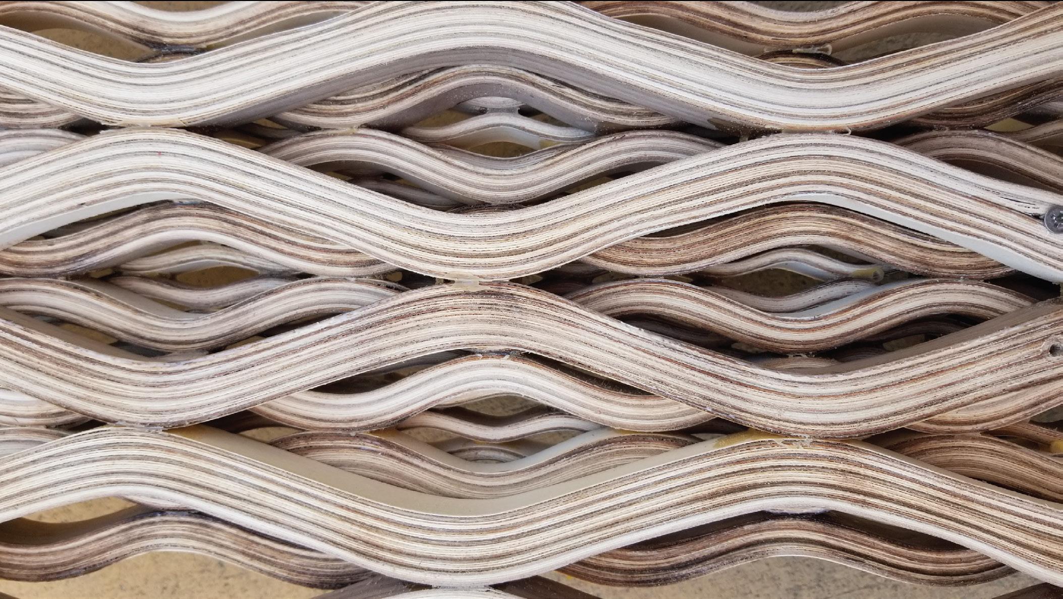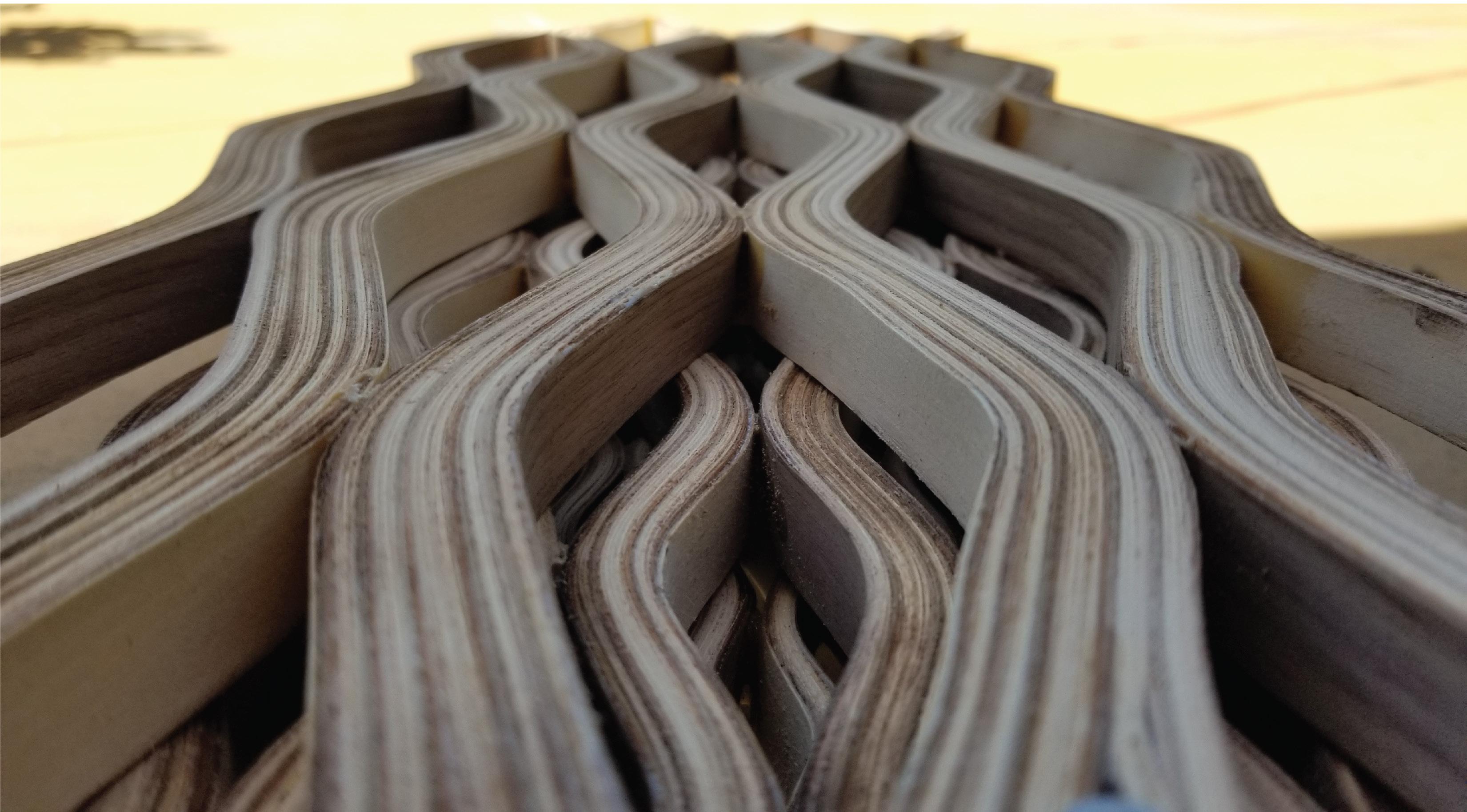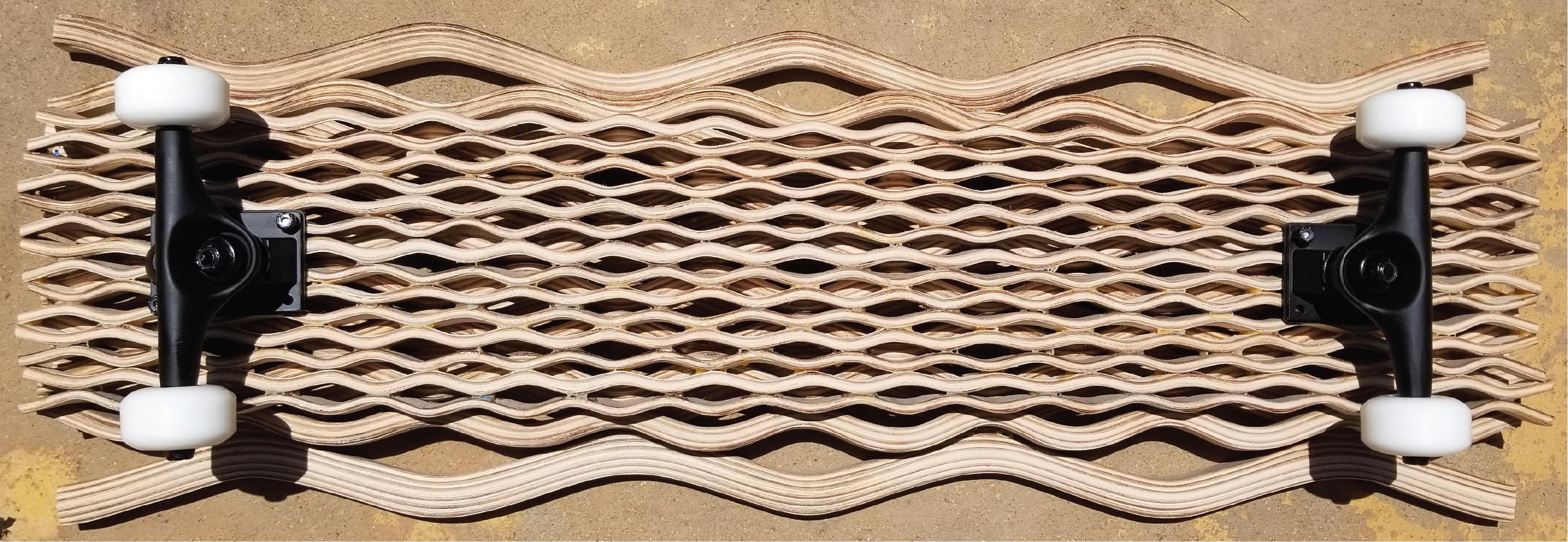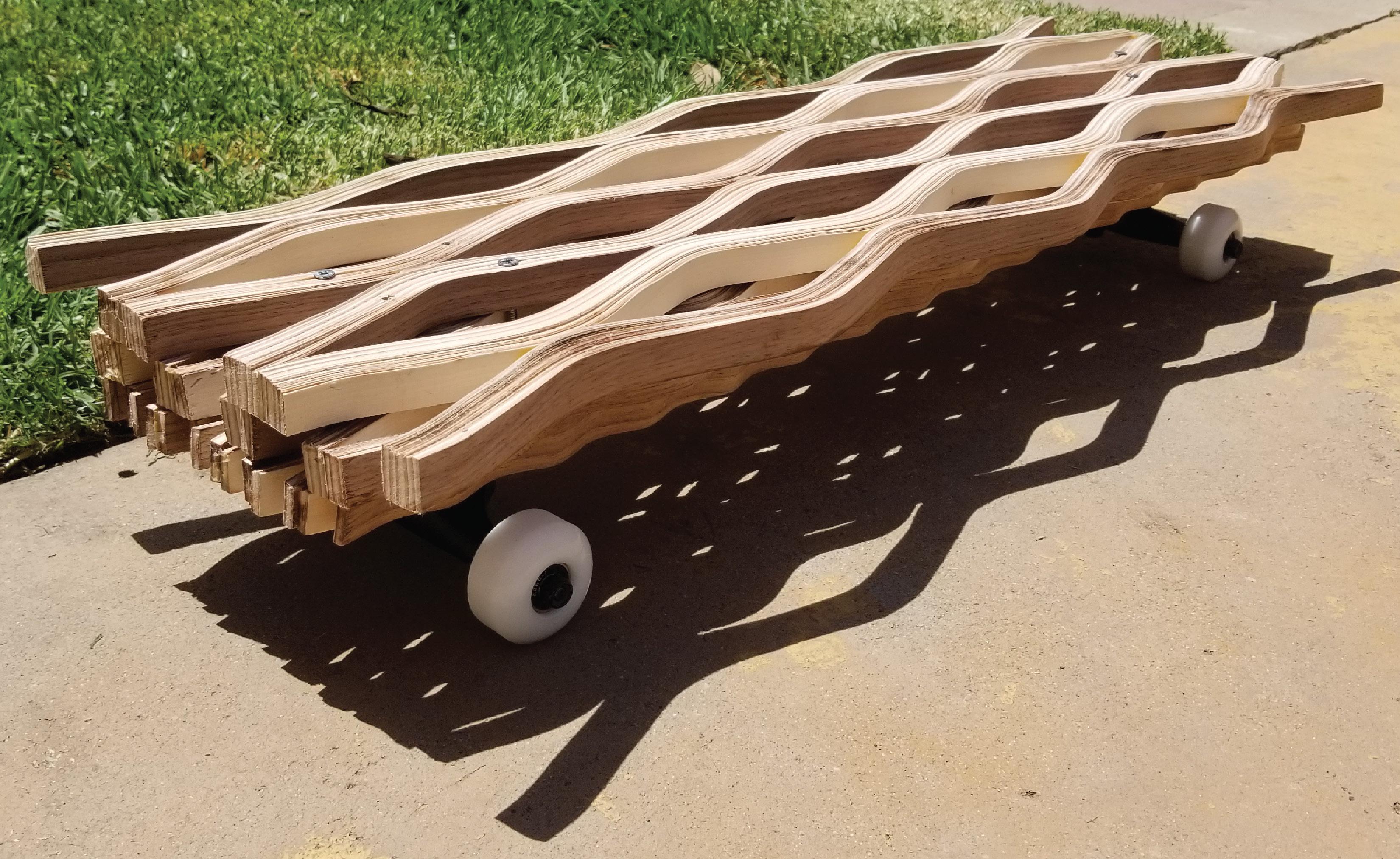 The skateboard is created with three layers of wood laminate that was bent, and glued together to create waves of varying size. The skateboard mimics the pattern of waves to relax the mind. The layers and the design allows for the skateboard to be study and able to withstand a lot of weight and pressure.