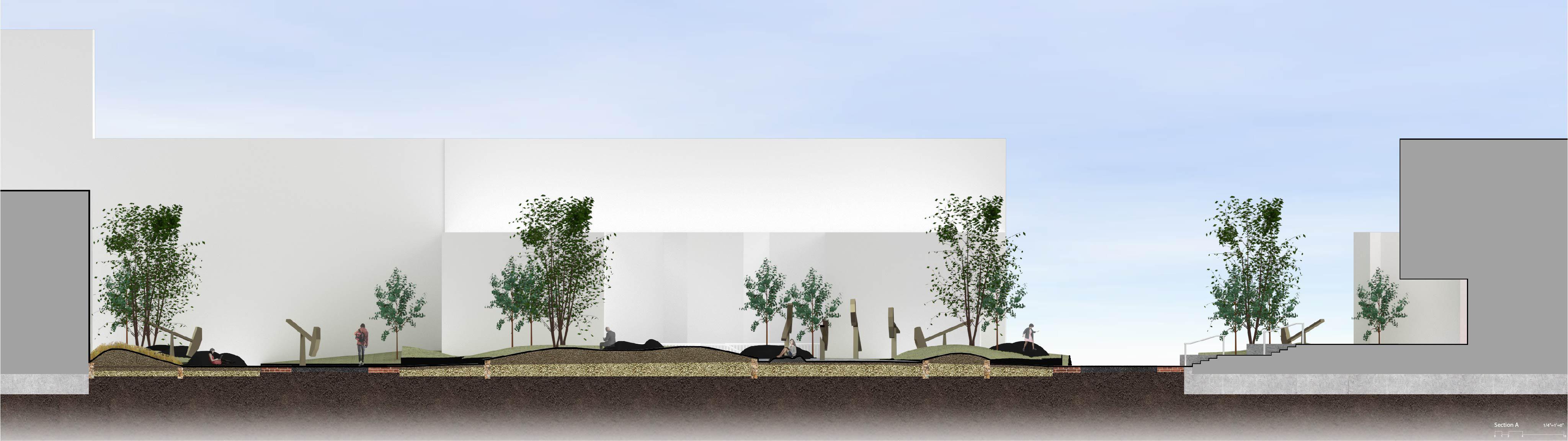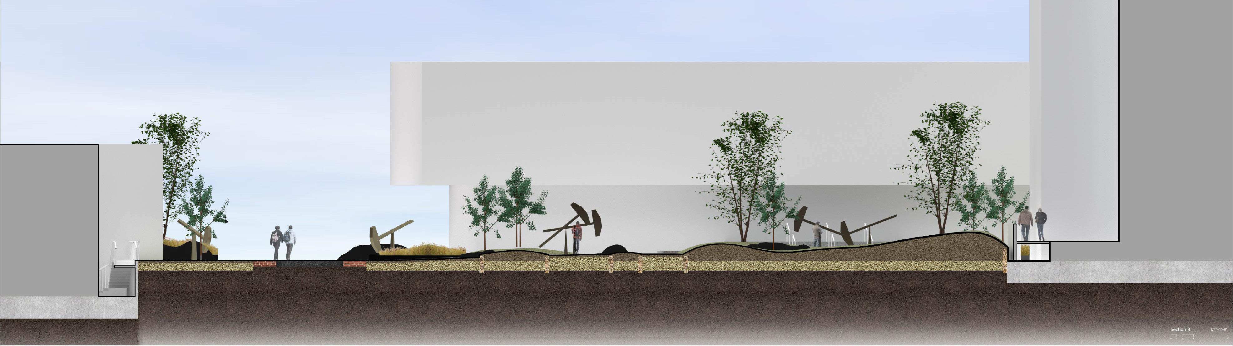 The project is focused on re-designing the plaza using already existing landscapes from completely natural, to designed, to industrial.