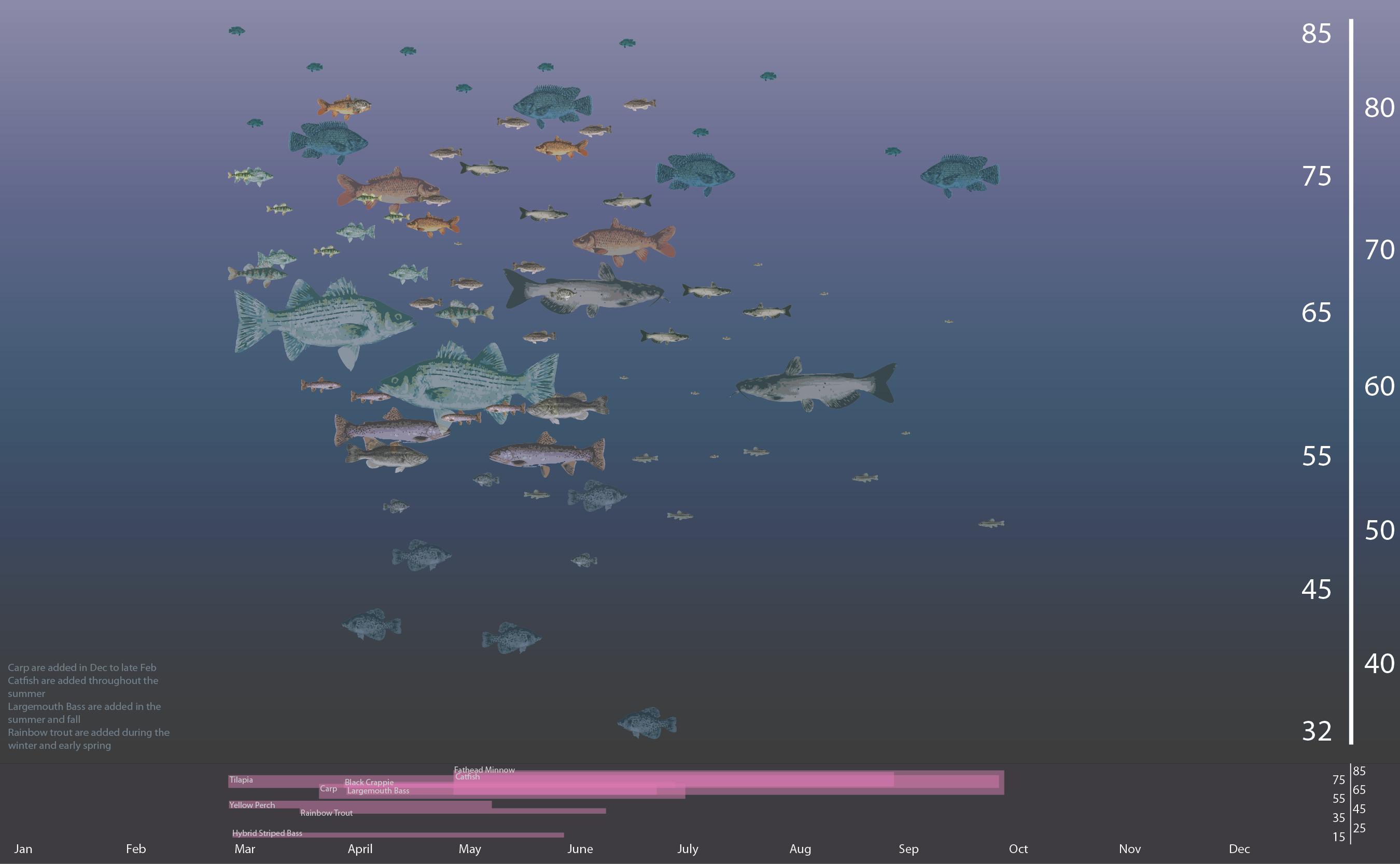 The Fish Calender below is to help people understand what the best depth is to catch certain type of fish as well as what their seasonality. The pink bars below are when each type of fish are in breading season. The numbers to the right are the temperatures that are ideal for the fish to thrive.