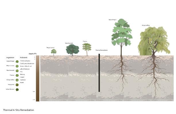 The site is located on a previous Oil Dilling Site, which lead to research on the ways of re-mediating the soil. Given the hopes for the site the safest form of remediation that will last for generations is a combination of Thermal In-Situ Remediation and Phyto Remediation. Thermal In-Situ Remediation allows for 100’ deep remediation that can break down the residual chemical toxins in the soil