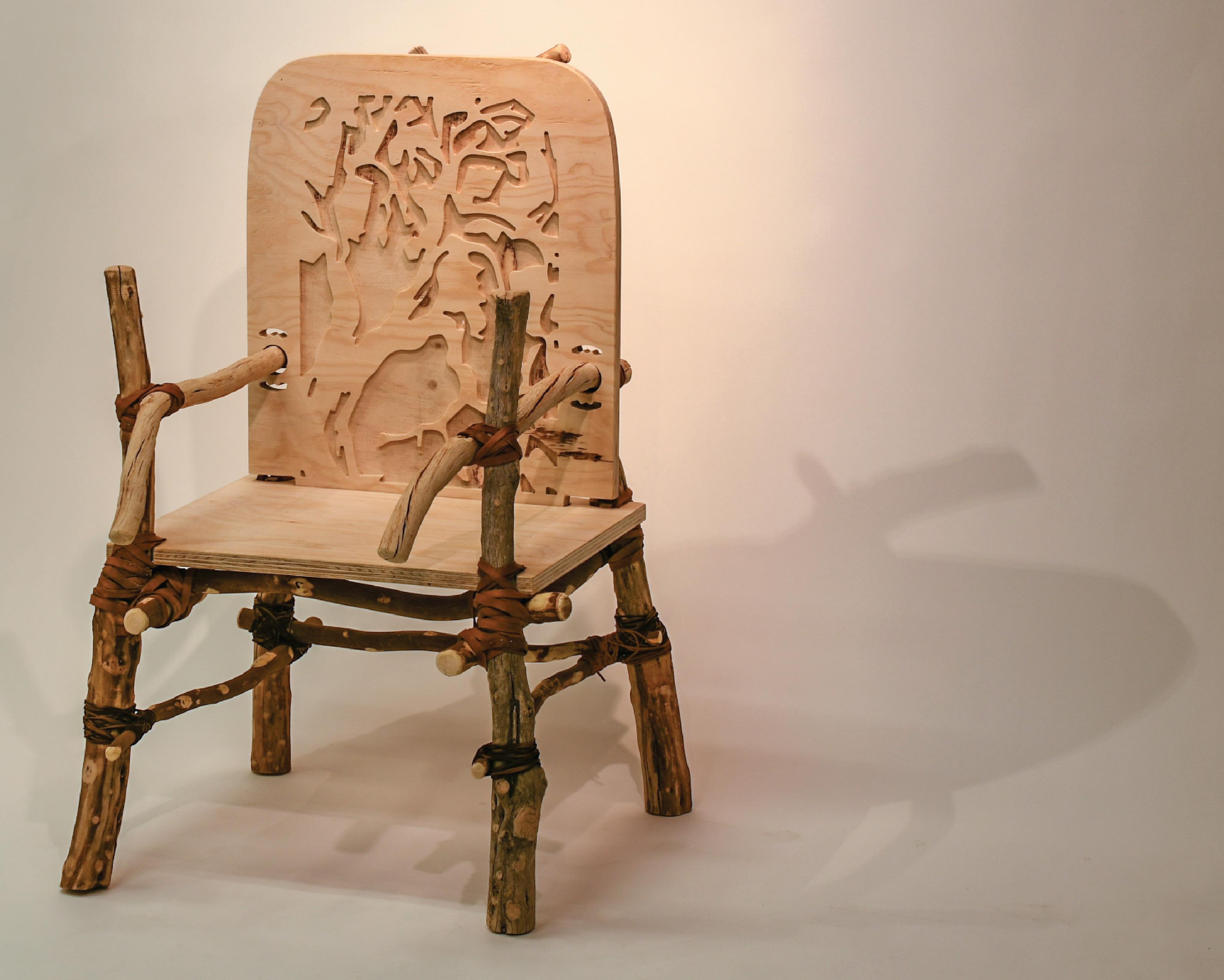 All of the base, supports, and arms of the chair are branches that were cut from trees. I then cut them down to the length I desired and sanded and rounded out the edges. The cnc portion of the chair is the back rest and seat, the back rest has a cut out of the tree of life.