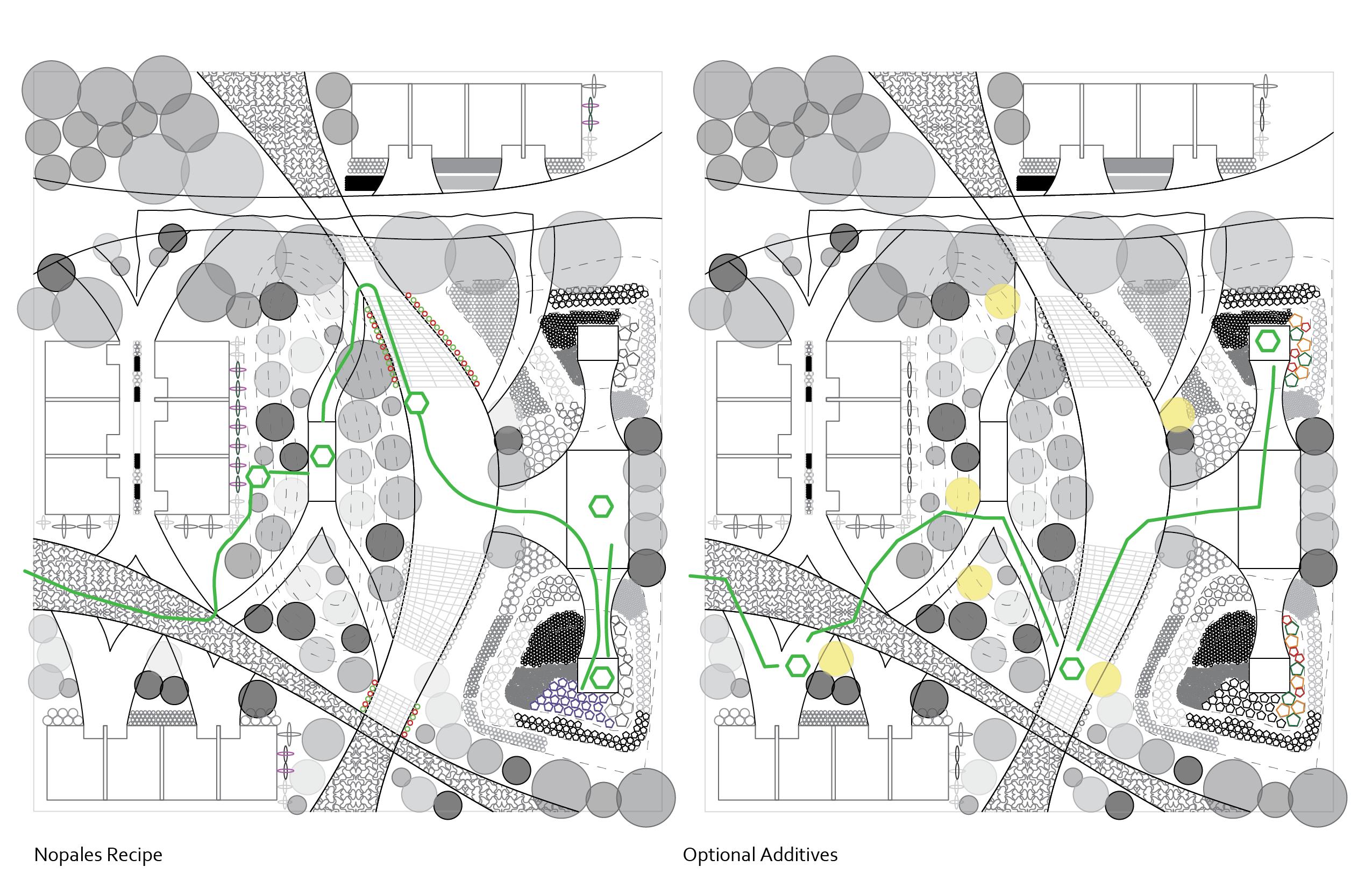 The plan on the left shows one of the many paths that can be taken to collect the ingredients to make Nopales. All the plants are highlighted to show the location of all the ingredients, as well as the many stops that can be made while gathering the ingredients. The plan on the right show the extra optional ingredients that can be collected to add more to the Nopales Recipe.