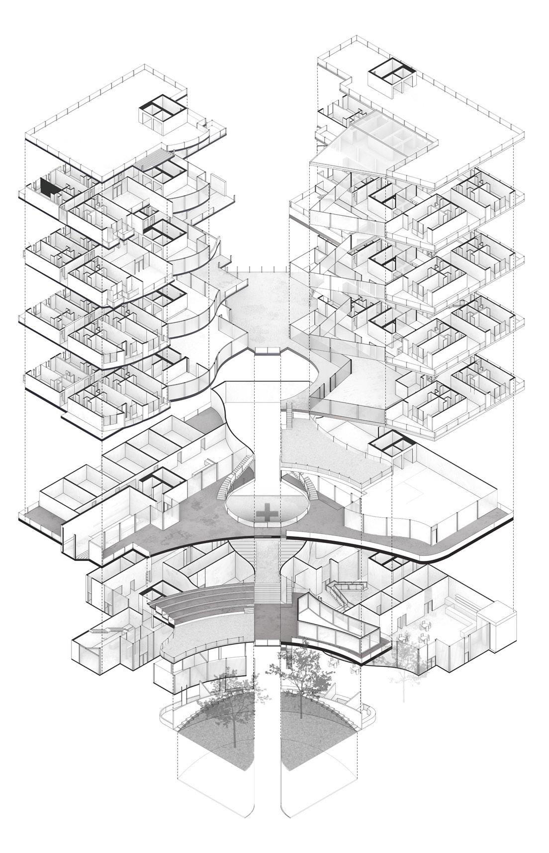 Parity Arcadia’s core concept of “Surveillance and Surveilled” addresses the emotional and psychological needs of the residents while provoking social empathy for these marginalized people. The design weaves public and private spaces together to reflect the reintegration process from isolation to community participation. It challenges society’s perception of these individuals, proposing architecture as a powerful catalyst for breaking the cycle of reoffending, resonating with hope, respect, and opportunity, utilizing Freudian concepts: the id, the ego, and the superego and going to the root of the problem to re-invent a viable theory.