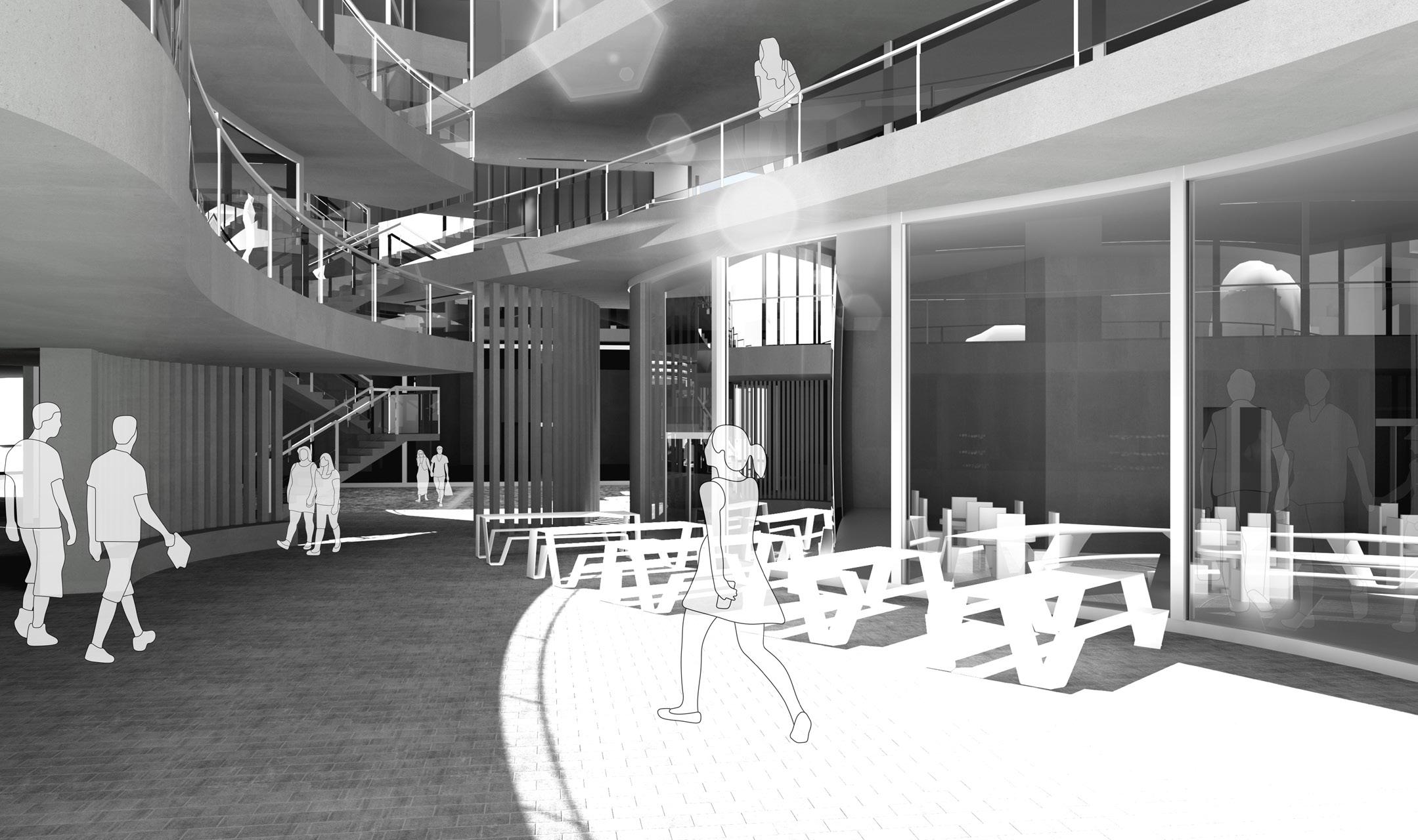 At the heart of the school is the concept of ‘architectural harmony’ - how architecture reflects and enhances human emotions and interactions. The spaces included are designed not only for musical performances but also for monumentality as a symbol of outreach to the community. A relationship between solid and void is conastructed by utilizing the pure, minimalist geometry of the exterior to the views and interactions of the interior ramps.