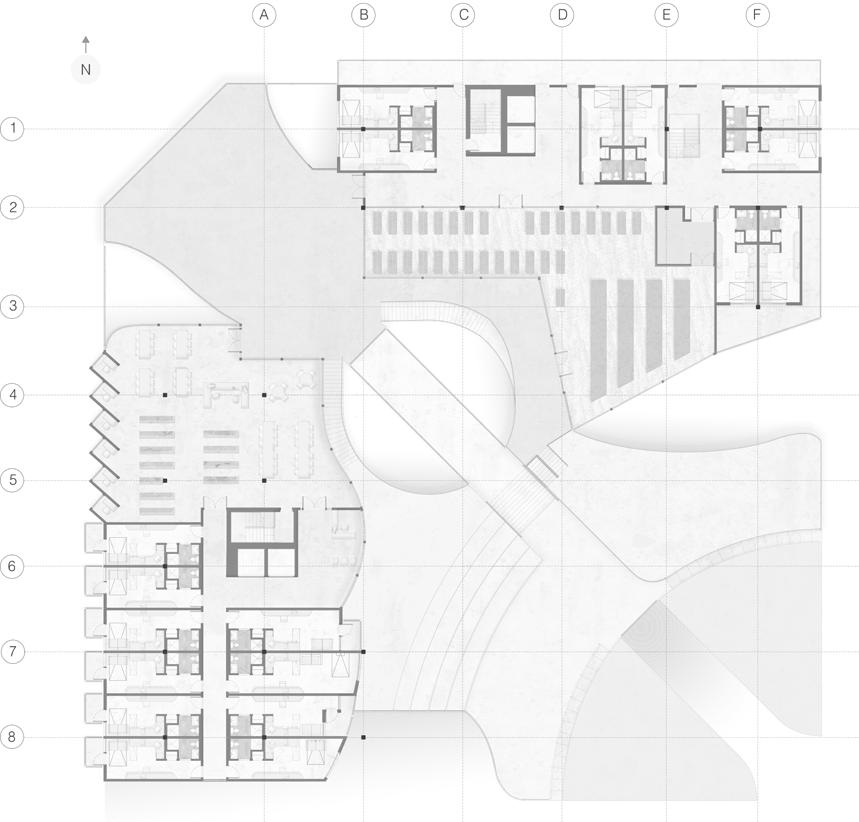 The bottom is an open public space. The original trees in the site are utilized as a natural boundary. At the same time, it can be used as a public rest area. Adjacent functions are the coffee shop, restaurant, bookstore, and musical instrument store, all open to the public. In addition, the school area has halls, pavilions, and social spaces.
