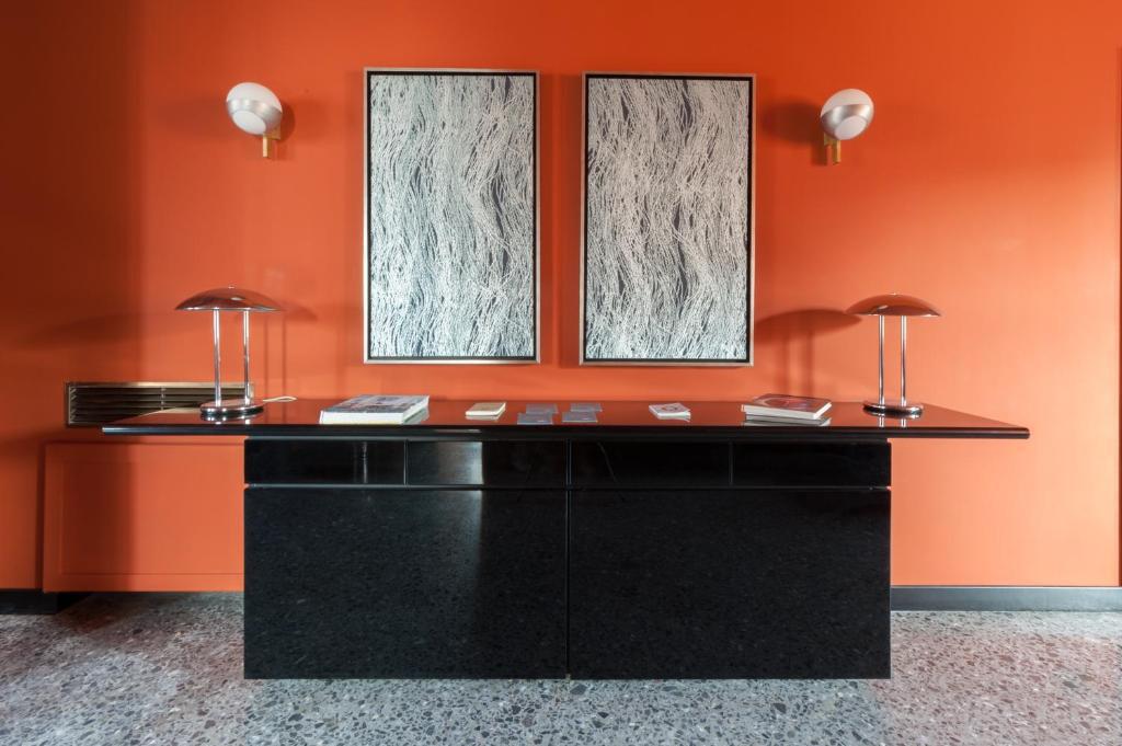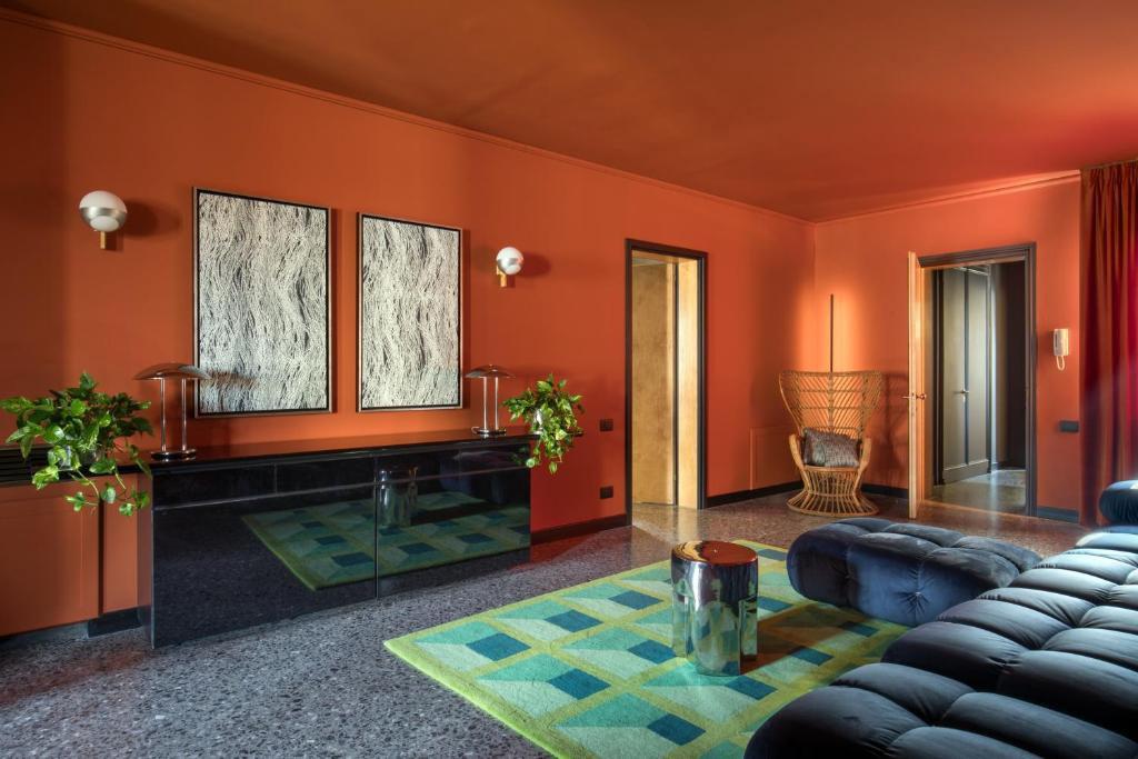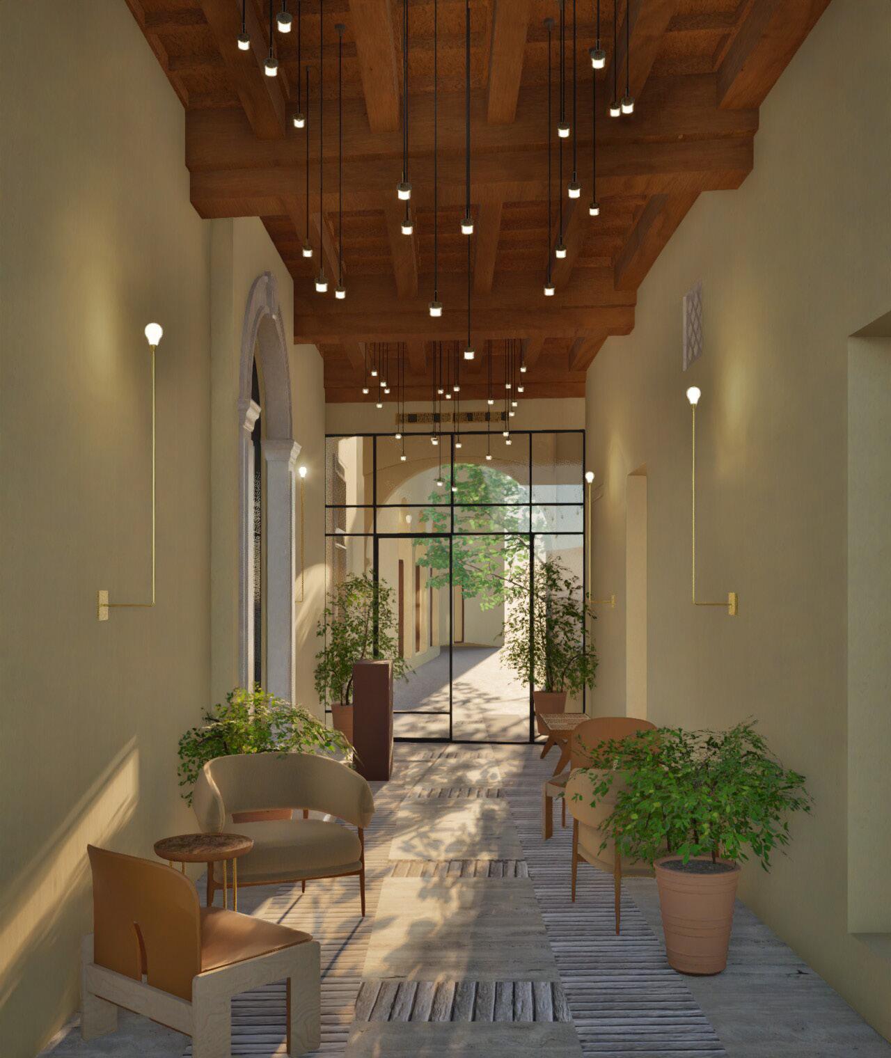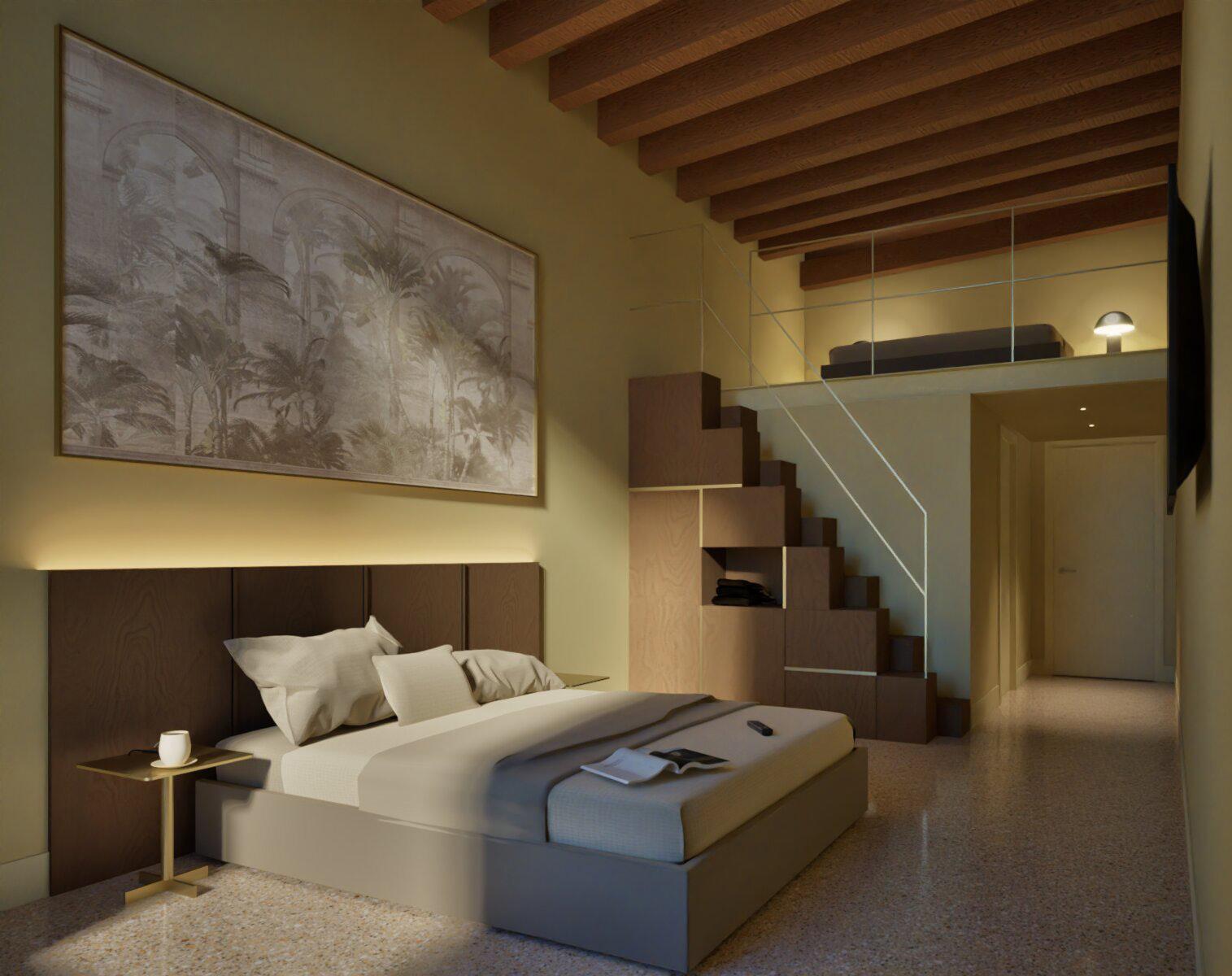 The flooring and select furniture pieces feature a modern adaptation of traditional terrazzo, paying homage to the Venetian craftsmanship while adding a contemporary twist. Wooden elements are carefully chosen to match the color and texture of the building’s original beams, ensuring a seamless blend of old and new. The walls, too, are designed to reflect the textures and tones of the original surfaces, creating a sense of continuity throughout the space. This thoughtful fusion of heritage and modernity creates a unique hotel experience that reflects both the cultural richness of Vicenza and the timeless elegance of the building’s historical roots.