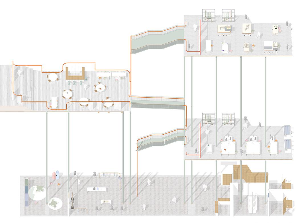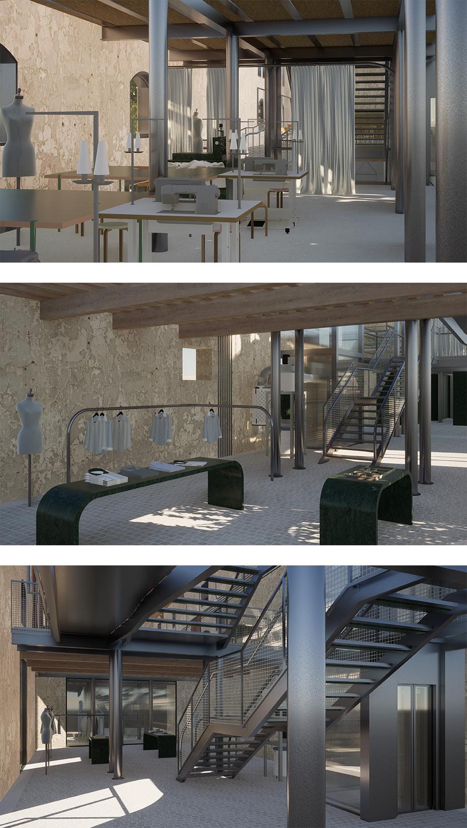 For the adaptive reuse of the theatre, we envision repurposing the space into a dynamic fashion hub that offers flexible spaces adaptable to various uses. This new function would cater not only to the fashion industry but also to the daily needs of local residents. To support local sustainable production, we have incorporated fashion workshops and a multifunctional exhibition and shop area on the ground floor. This would provide a space for the local community to engage with sustainable fashion practices, while also fostering a sense of continuity between the town’s rich industrial heritage and its future development.