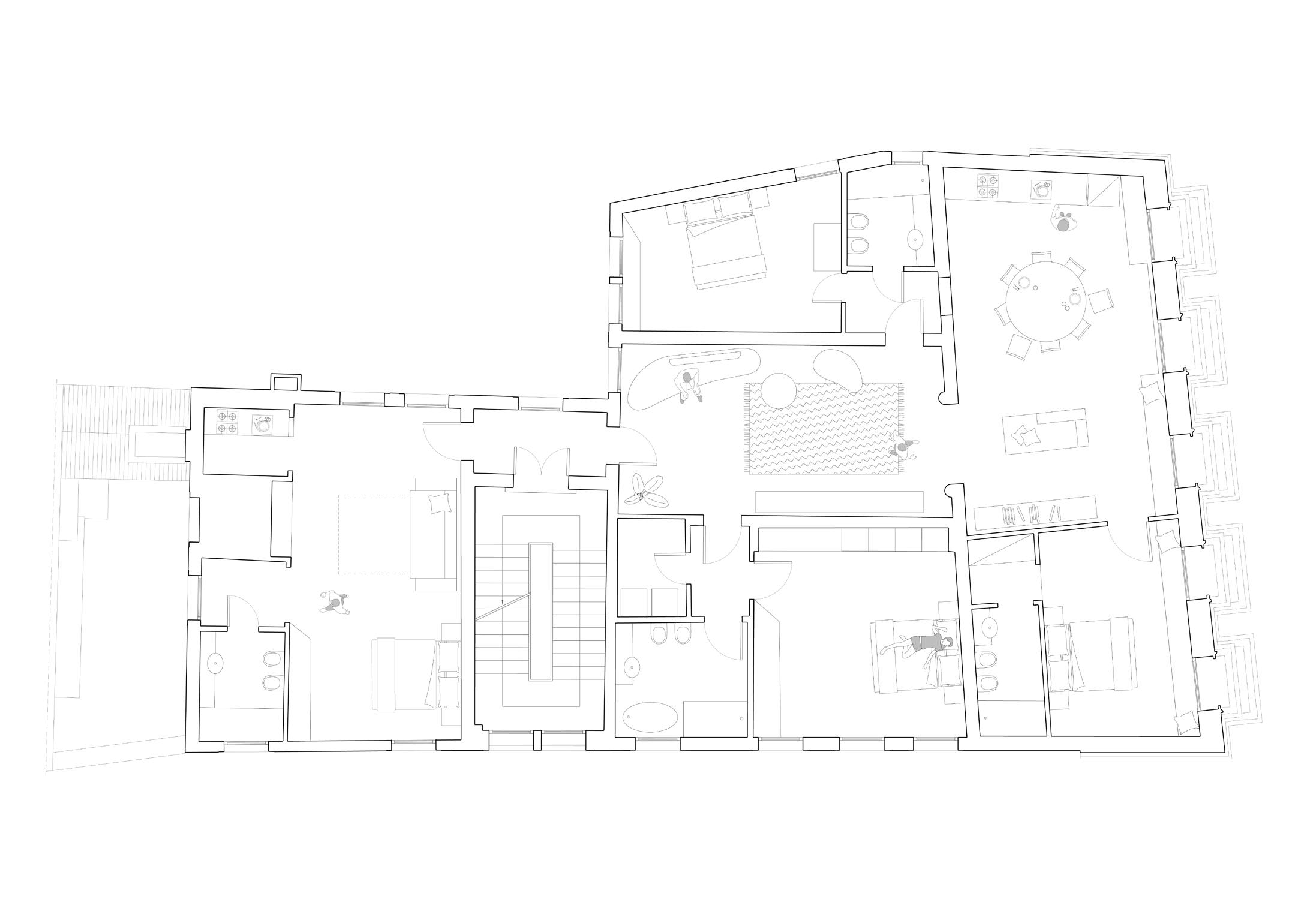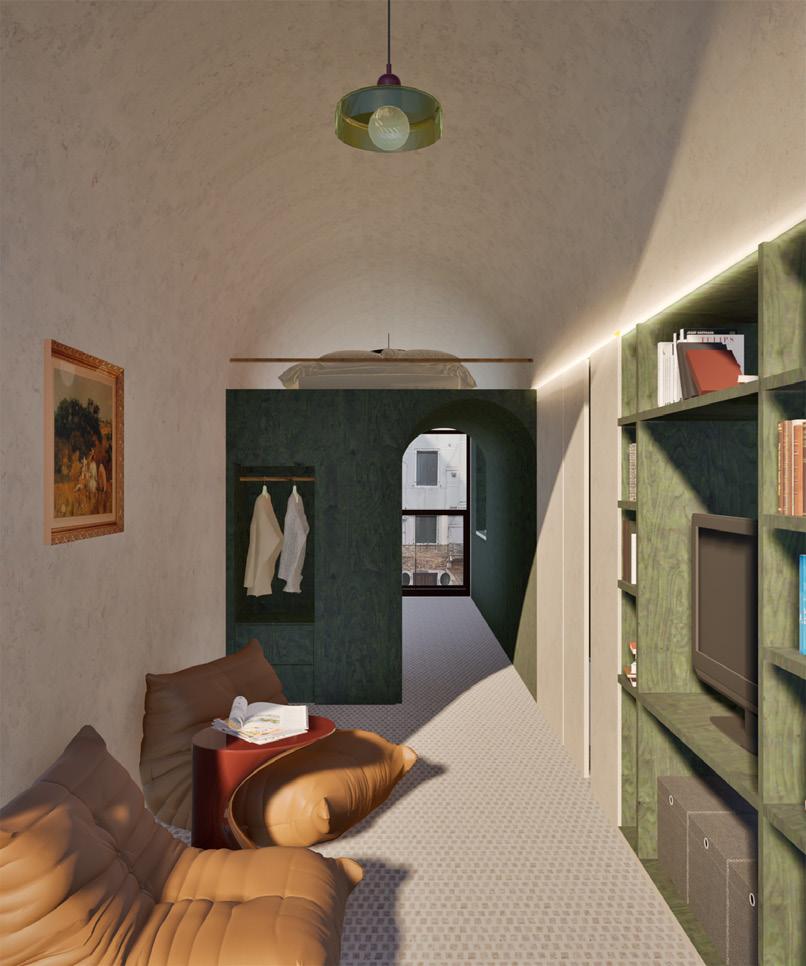 The distinctive green color of Venetian window shutters is reinterpreted in the design through built-in wooden furniture, of the library, kitchenette, storage, and bathroom units. The use of wood not only enhances warmth and tactility but also reinforces a connection to Venice’s traditional craftsmanship.