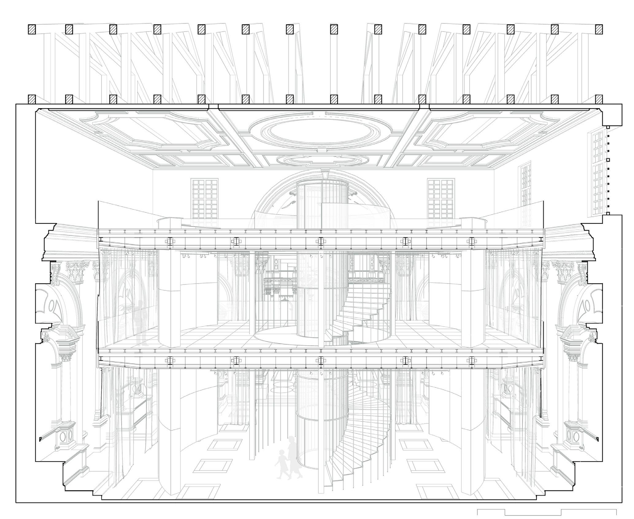 The exhibition project requirements was based on the list of the exhibit pieces (models, drawings, books, sketches etc.) and how it can be placed inside of the church in order to provide a comfortable experience. For that goal it is decided to build a structure inside of the church, in other words, a box in a box. Although being abandoned for many years, the church itself has really important features that we would like to include into our design. We take into consideration the modulation of the wooden ceiling decoration and we referenced its center for the circular staircase. This harmonious blend of historical and modern elements ensured that the exhibition honored the church’s past while providing a fresh, immersive experience for visitors.