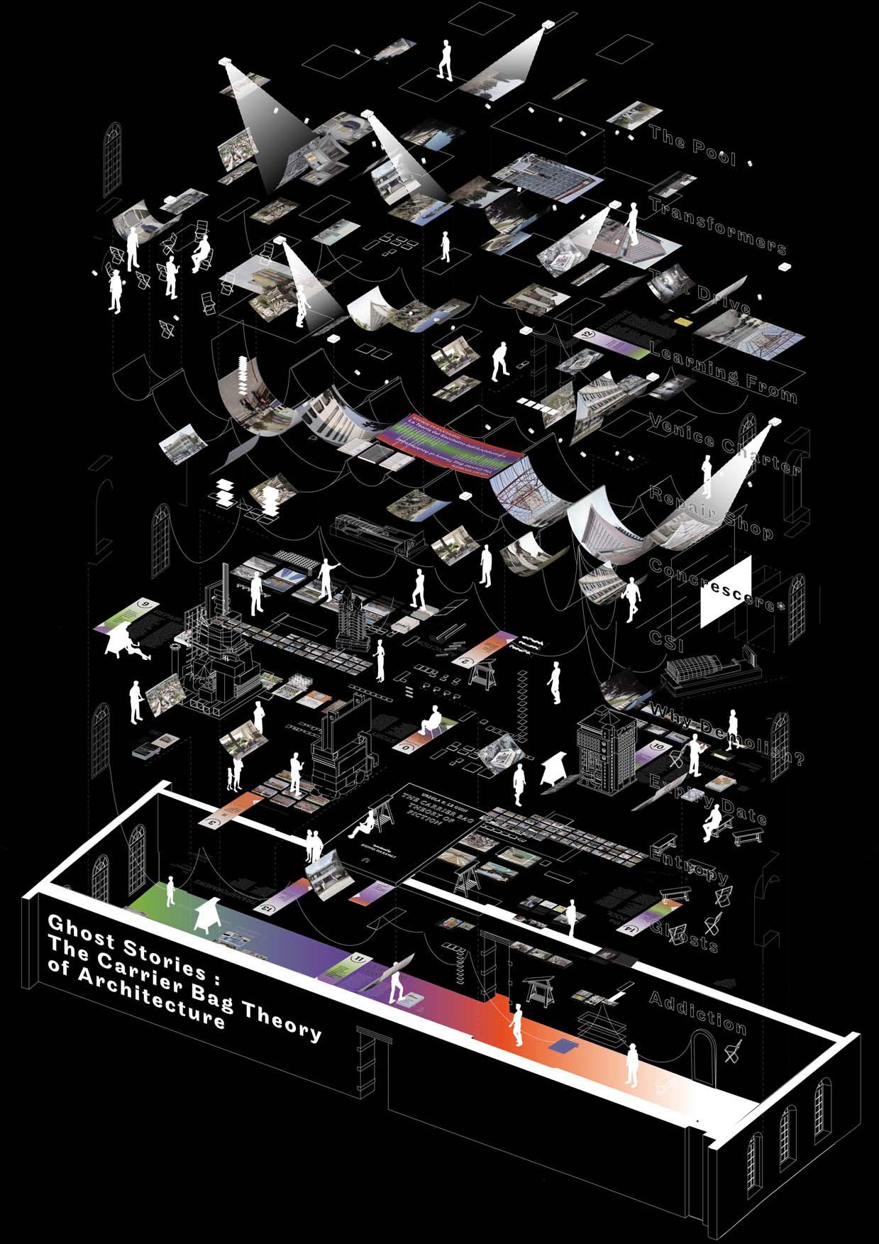 Ghost Stories: The Carrier Bag Theory of Architecture questions the accepted perceptions of and approaches to buildings to reveal more hopeful proposals for the future. Elizabeth Fisher’s Carrier Bag Theory of Evolution argues that, rather than hunting tools, the first cultural device used by humans was probably a carrier bag, which allowed them to transport the vegetables they gathered. Ursula K. Le Guin’s 1986 essay, “The Carrier Bag Theory of Fiction,” expanded this idea, moving away from the notion of the weapon-wielding hero. Based on this, the exhibition suggests listening to and understanding the stories of abandoned buildings, rather than focusing on more heroic, successful examples.