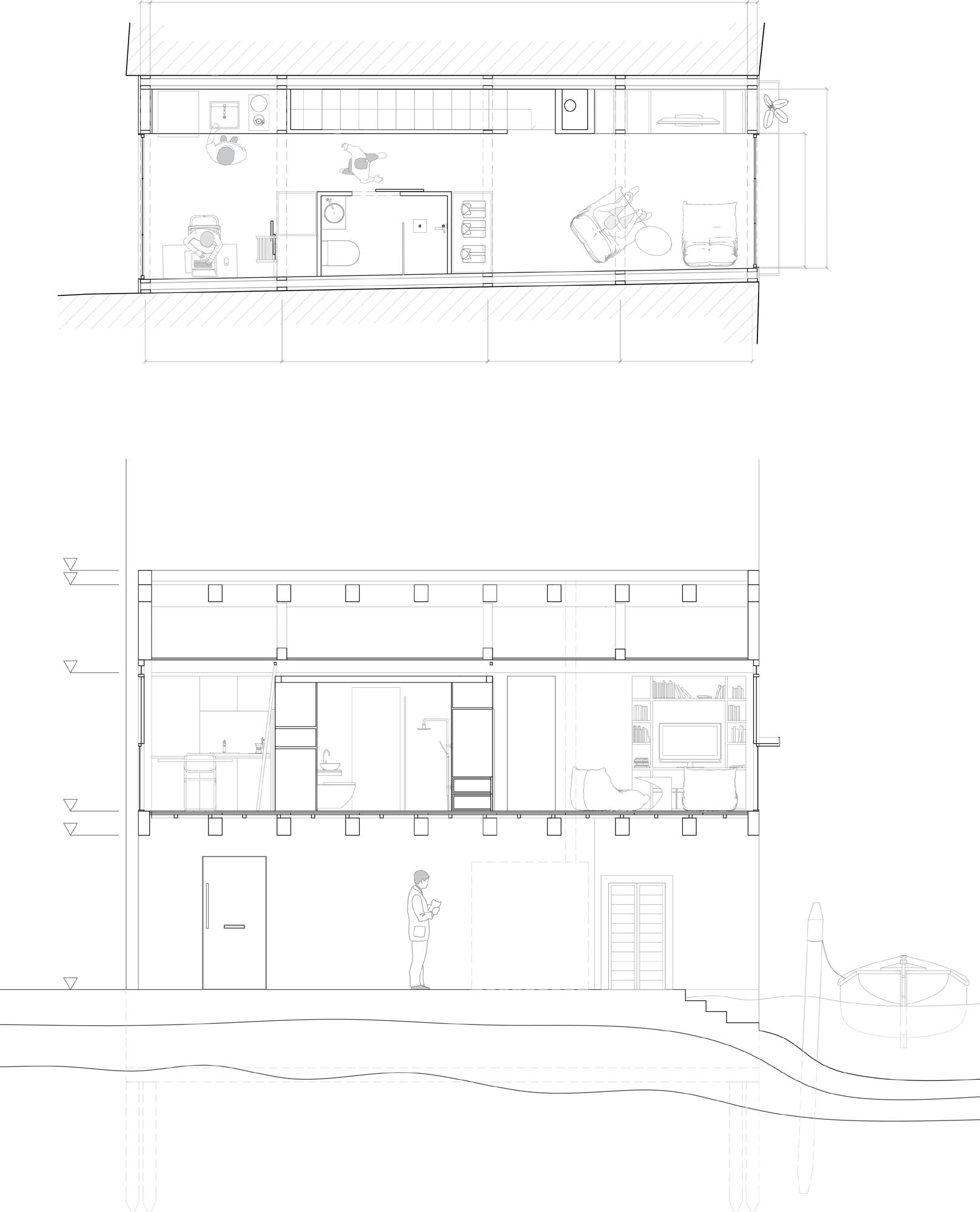 Inspired by historical Venetian wells, the design incorporates a water tank alongside a slanted roof to facilitate efficient rainwater collection. This modern adaptation pays homage to Venice’s traditional water management systems while integrating contemporary sustainable solutions, ensuring a self-sufficient and environmentally conscious approach to water usage within the project.