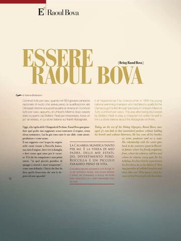 Today, on the eve of the Peking Olympics, Raoul Bova, now Oggi, alla vigilia delle Olimpiadi di Pechino, Raoul Bova può guaraged 37, can look at that unattained podium without holding dare quel podio mai raggiunto senza trattenere il respiro, senza his breath and without bitterness. He has won all his battles: alcun rammarico. Lui ha già vinto tutte le sue sfide: come attore, as actor, producer and as a man. produttore e come uomo. His relationship with the water goes Il suo rapporto con l’acqua ha origine La Calabria significa tanto back to the summers spent in Roccelnelle estati vissute a Roccella Jonica, per me. È la terr a di mio la Jonica where his family originates sua città d’origine, dove vive la famiglia padre, delle mie estati, from, where his relatives still live and e dove torna ogni anno per le vacandel divertimento puro. where he returns every year for his ze. È lì che ha conquistato i suoi primi Roccell a è un piccolo holidays. It is here that he experienced amori, “in quel piccolo paradiso di paradiso pieno di vita. his first loves, in, as he defines it “that spiagge a ciottoli e mare trasparente”, tiny paradise of cobbled beaches and come ama definirlo. Chissà che fine ha Calabria means an awful lot to me. It is my father’s home, the place where clear-blue sea”. Who knows what befatto quella francesina che non lo deI spent my summers, a place of pure came of the French girl who back then gnava di uno sguardo! fun. Roccella is a tiny paradise full of life.