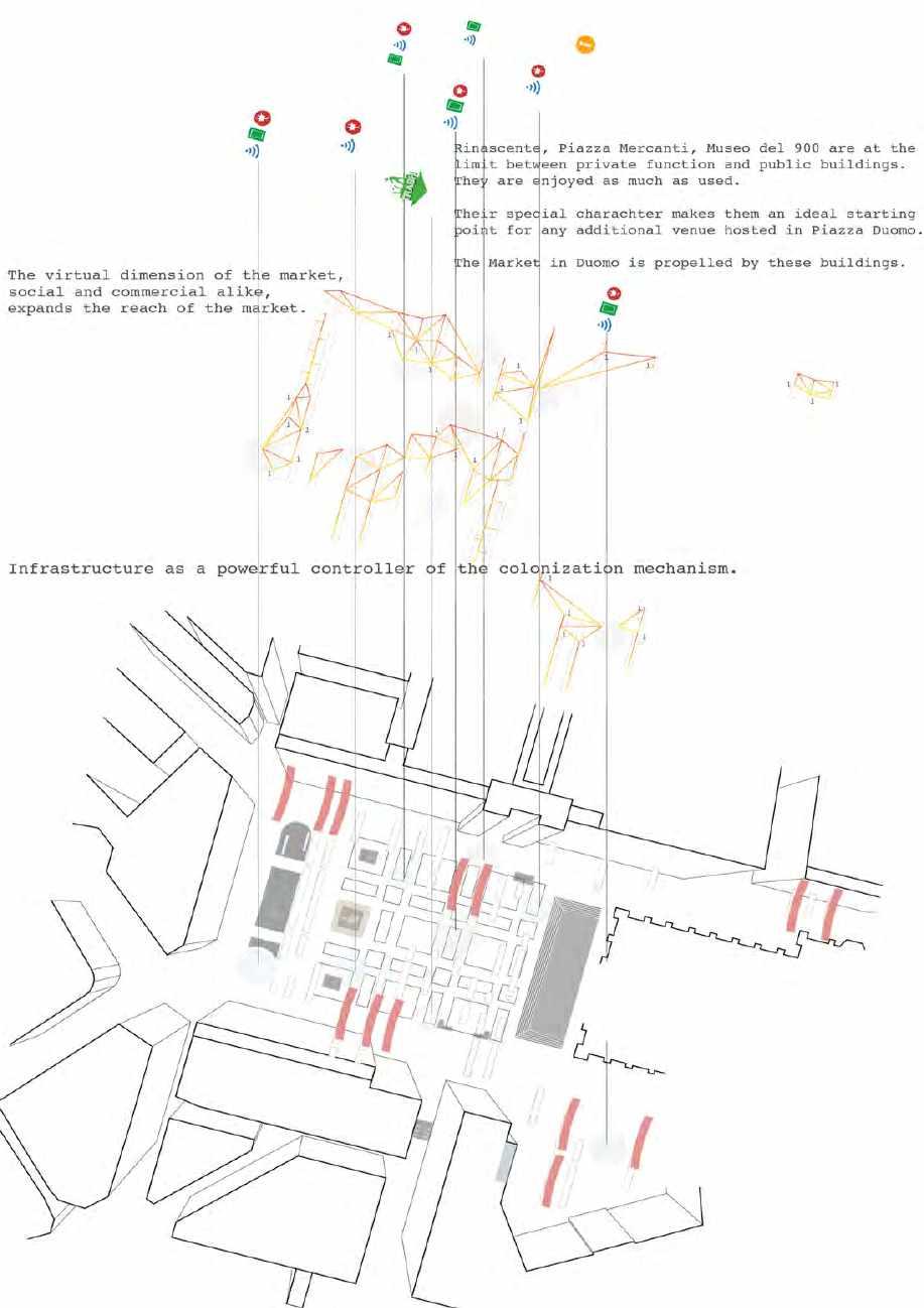Pre-existing structures that are notable for their function or their historical value; in other words, buildings that are capable to attract an audience and activate the surround-ing space. Rinascente, Piazza Mercanti, Museo del 900 are at the limit between private function and public buildings. They are enjoyed as much as used. Their special charachter makes them an ideal starting point for any additional venue hosted in Piazza Duomo. The Market in Duomo is propelled by these buildings.