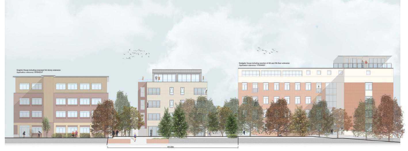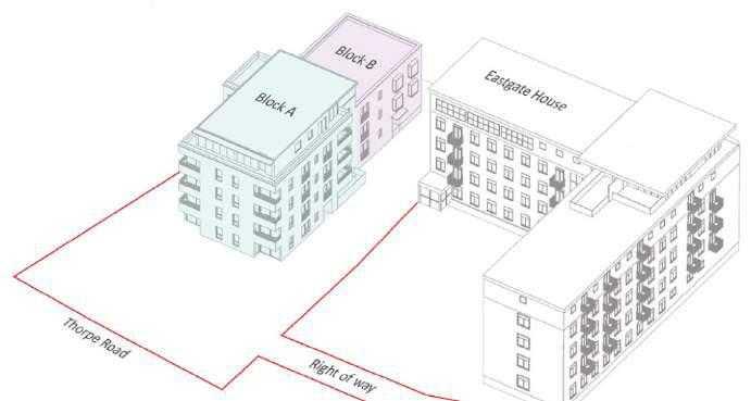 The massing of the building responds to the site context. The facade steps in on the eastern facade at Block B to allow additional distance between the proposals and Eastgate House to the east. Additional privacy has been designed in with oriel windows with obsure glazing on the bedroom windows facing Eastgate House.