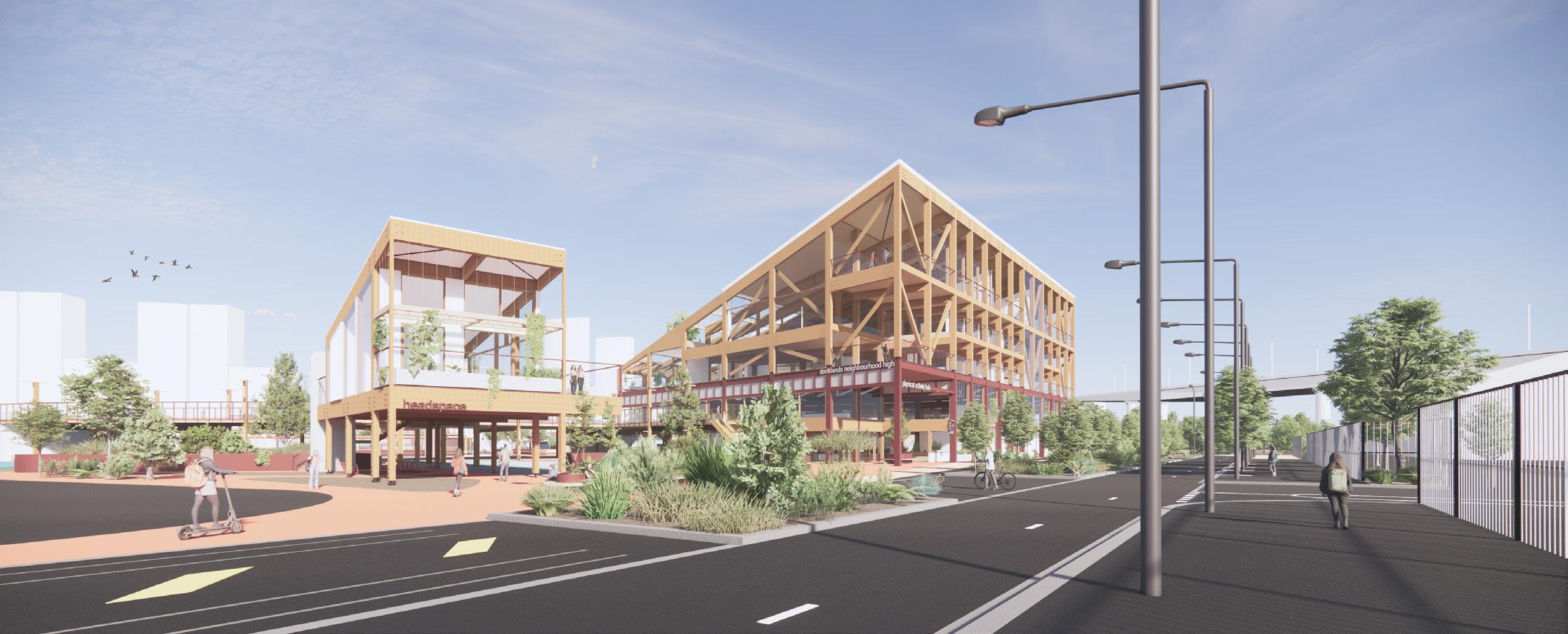 View from Docklands Drive toward Northern Elevation of Sports Complex, Headspace Facility, and through to Ron Barassi Snr. Park.
