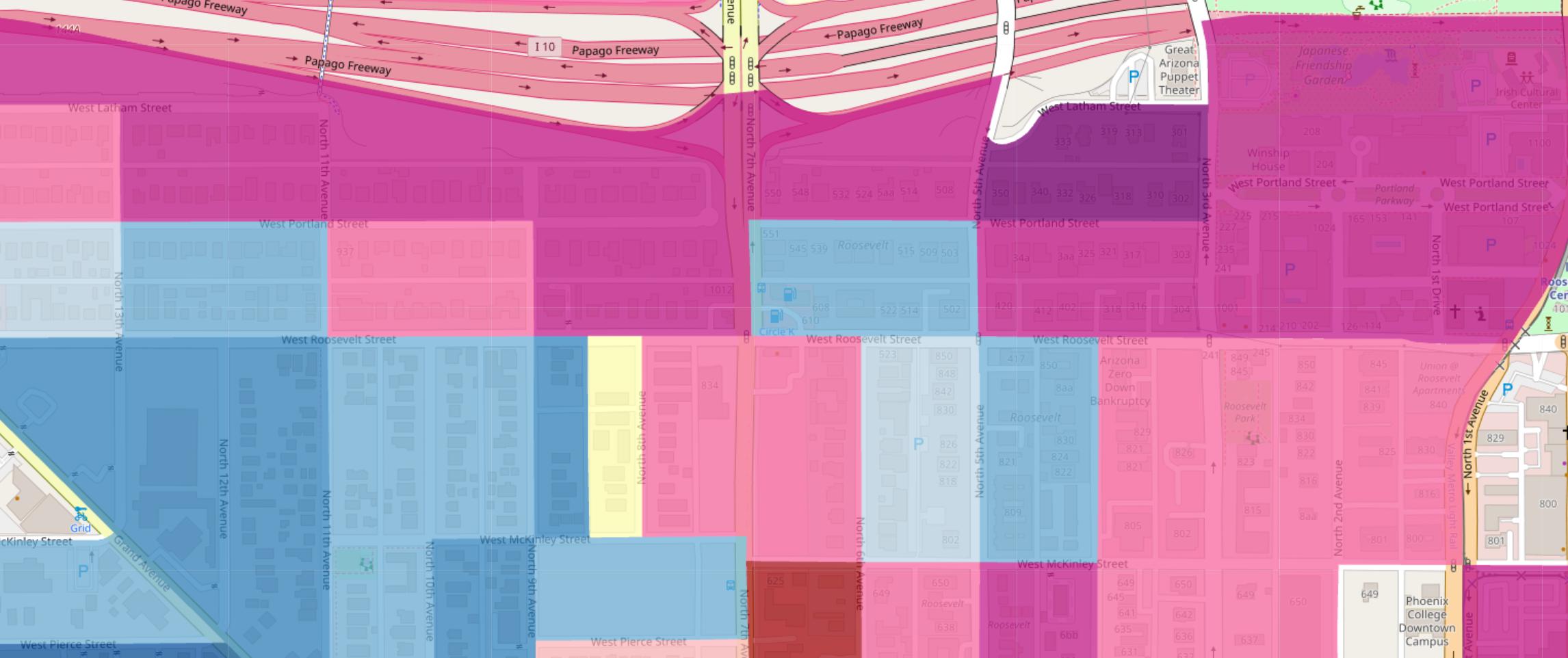 OUR SITE, LOCATED IN THE FAMOUS PHOENIX ART DISTRICT BENEFITS FROM BEING IN ROOSEVELT ROW, A STREET RENOWNED FOR ITS ABUNDANCE OF ART GALLERIES, LOCAL SHOPS, RESTAURANTS, AND ENTERTAINMENT. SURROUNDING BUILDINGS IN THIS AREA ARE ADORNED WITH MURALS PAINTED BY LOCAL ARTISTS, FURTHER ENRICHING THE CULTURAL AMBIANCE AND ATTRACTING PEOPLE FROM ALL AROUND PHOENIX TO PARTAKE IN THE VIBRANT EXPERIENCE. - SITE - BUS ROUTE - LIGHTRAIL ROUTE LEGEND