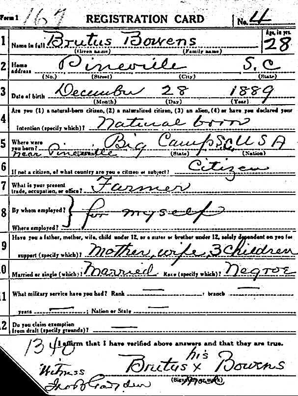 Trump promulgated the “big lie” and it is still readi- Brutus Bowens WWI Draft Registration Card ly embraced by conservatives and the legions of reactionaries, an aggregate of naysayers determined to flip the current political status and upend the Democratic hold on Congress and other important gubernatorial and senatorial races. We believe the next step, led by the Supreme Court, will seriously enforce gerrymandering and redistricting.