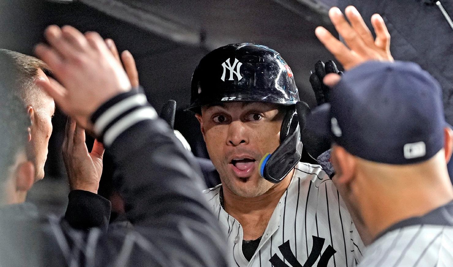 Yankees’ designated hitter Giancarlo Stanton celebrates with his teammates in the dugout after hitting a home run against the Cleveland Guardians on Monday in a 5-2 win in Game 1 of the American League Championship Series. (AP Photo/Godofredo Vásquez)