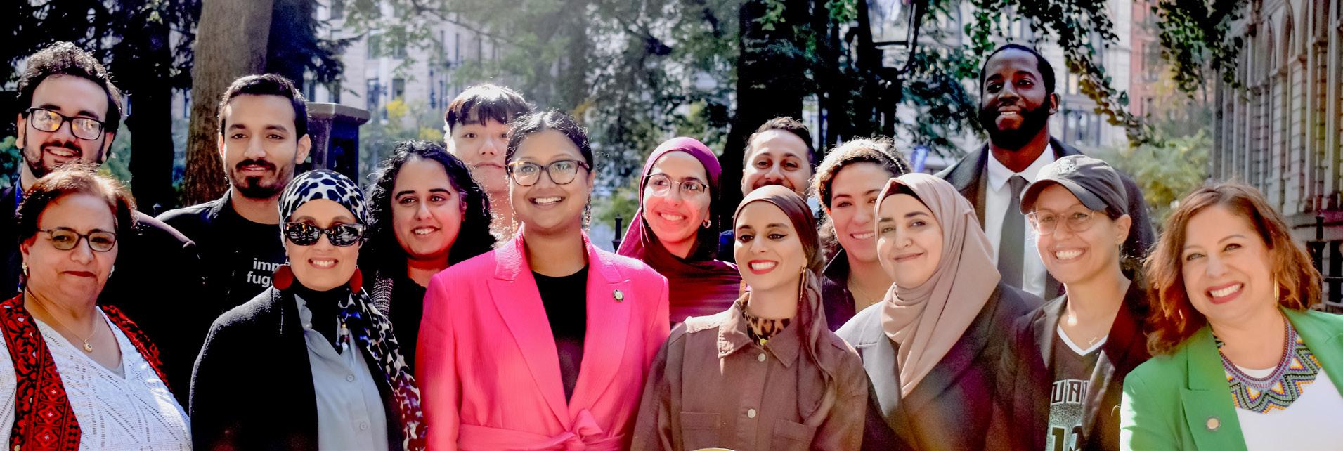 Councilmember Shahana Hanif and Assemblymember Jessica GonzálezRojas with Middle Eastern & North African (MENA) advocates and business owners at a press conference on Thursday, Oct. 10. (Ariama C. Long photo)