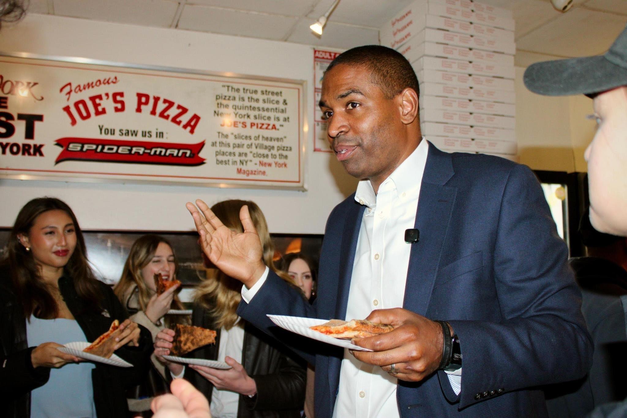 Lt. Gov. Delgado eats a slice of pizza with students at Famous Joe’s Pizza on Carmine Street in the Village. (Photos contributed by Delgado’s team)