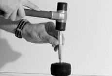 Legg hjulet på underlaget og slå ut aksel med gummiklubbe. 04
