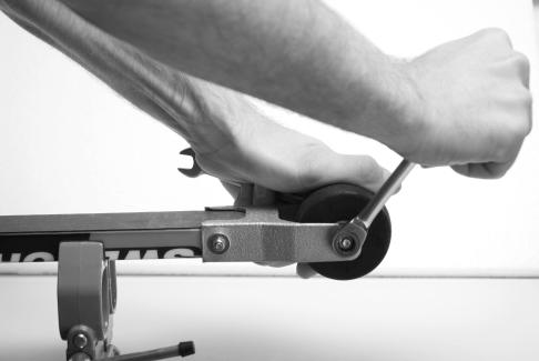 Place the skis upside down in a pair of vices. Make sure the wheel is placed as far down in the (fork) groove as possible. Lightly tighten the nut on the side shown in the picture.