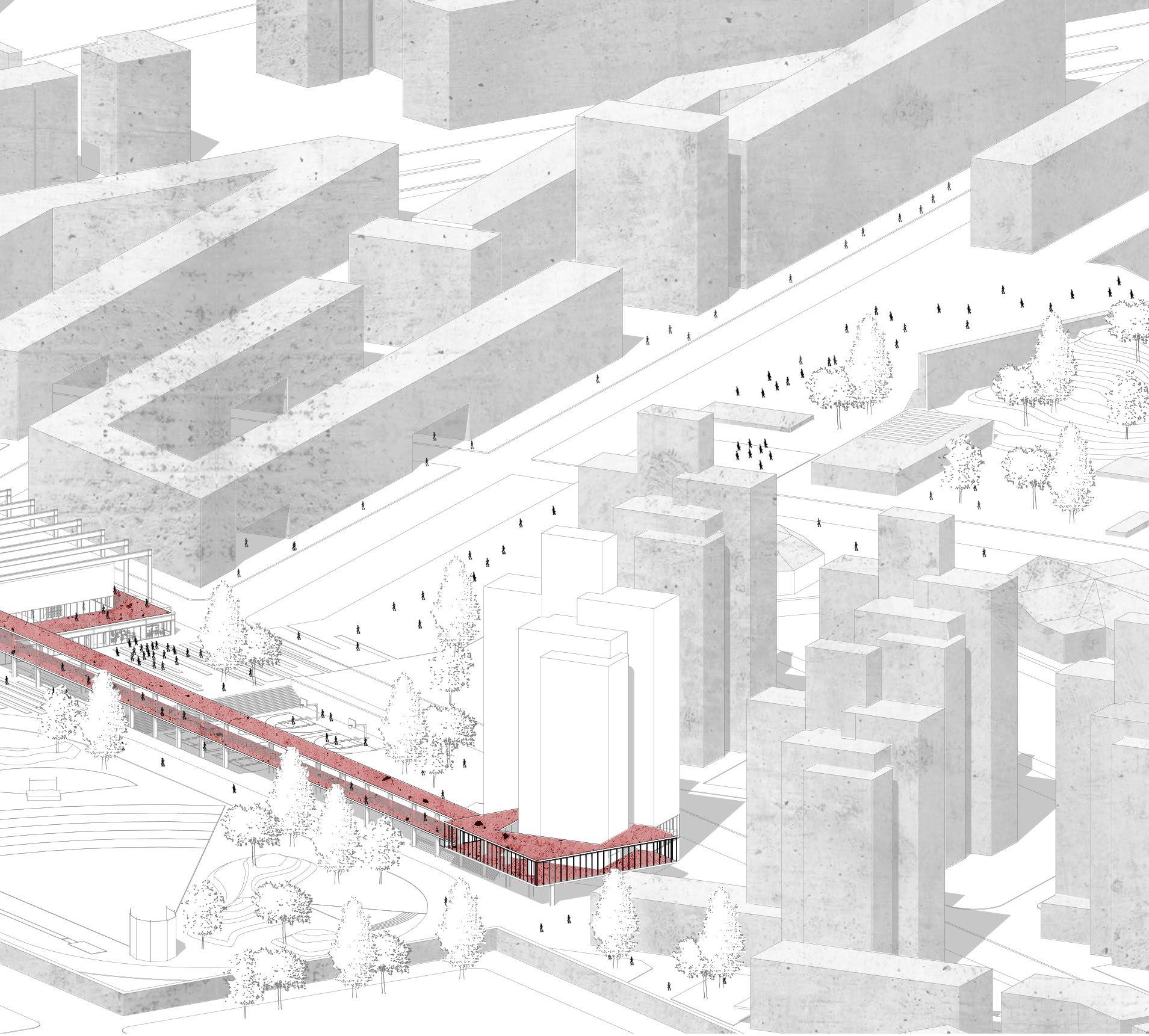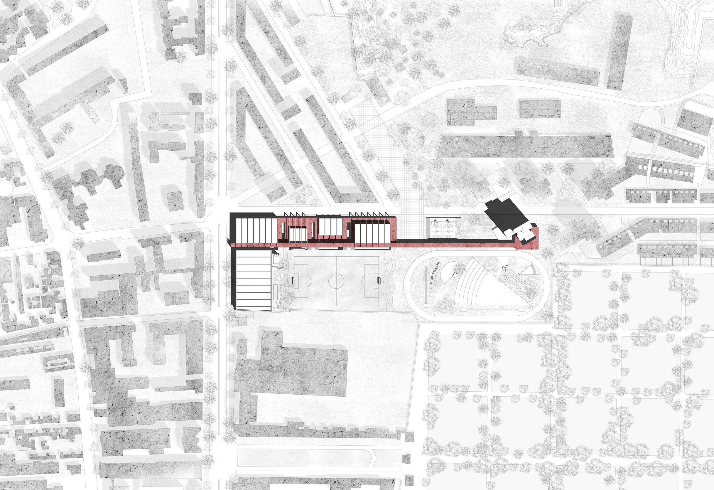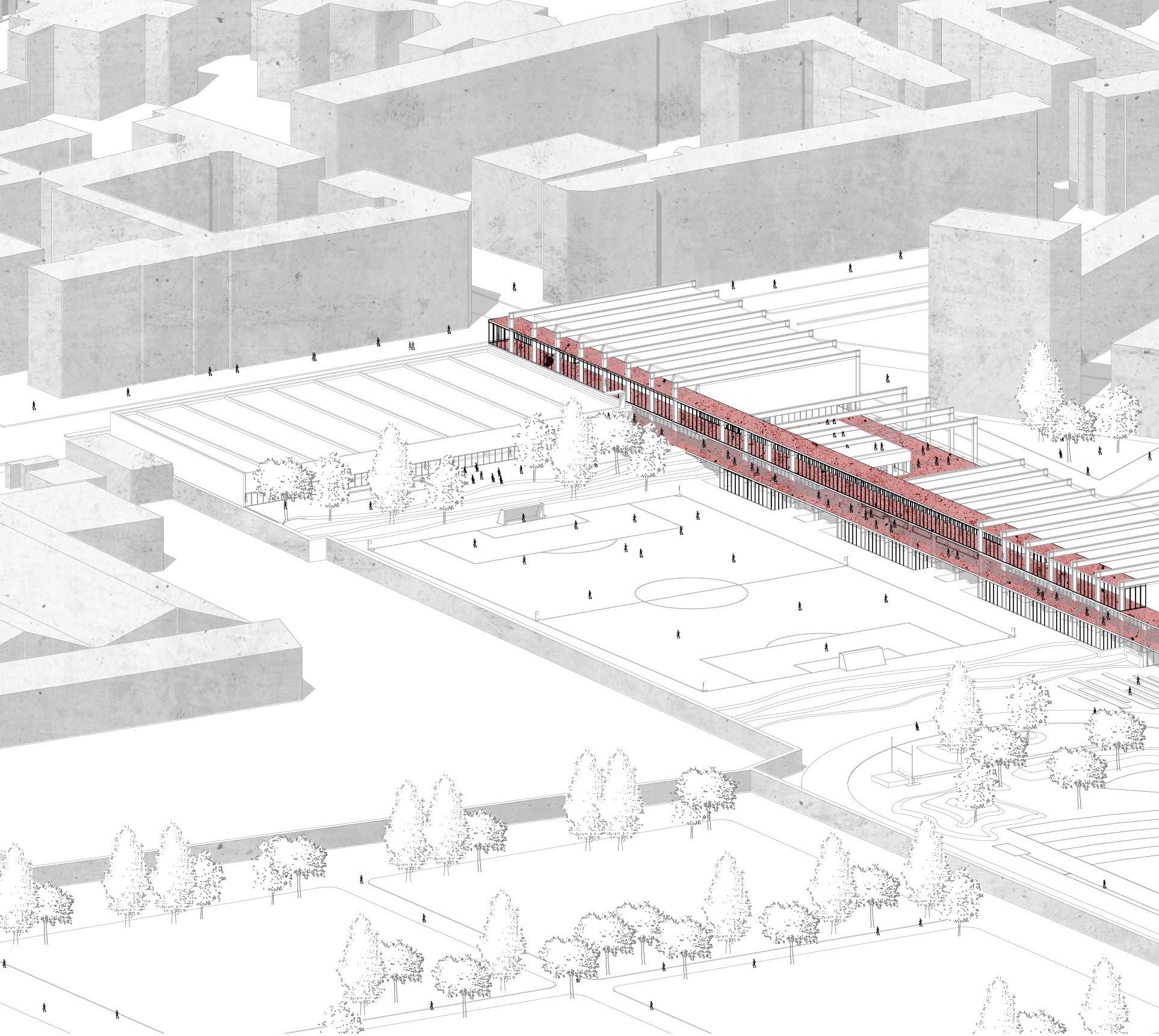 A mi-chemin entre équipements sportifs et promenade public, le bâtiment s’étend sur 300 mètres et se compose d’un socle servant et de gymnases articulés autour d’un passage couvert en niveau haut. Ce passage qui créait tantôt une promenade, des gradins ou des espaces partagées invite à inventer de nouvelles manières libres et auto-organisées de la pratique du sport.