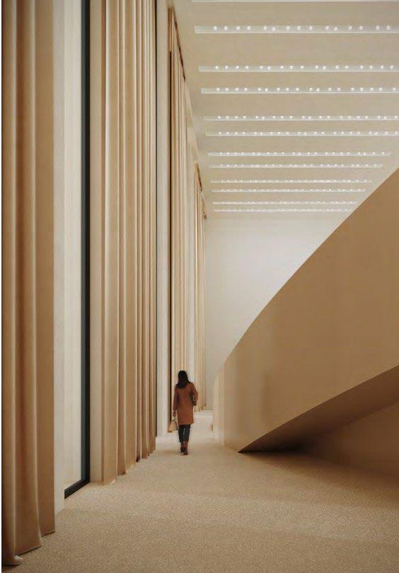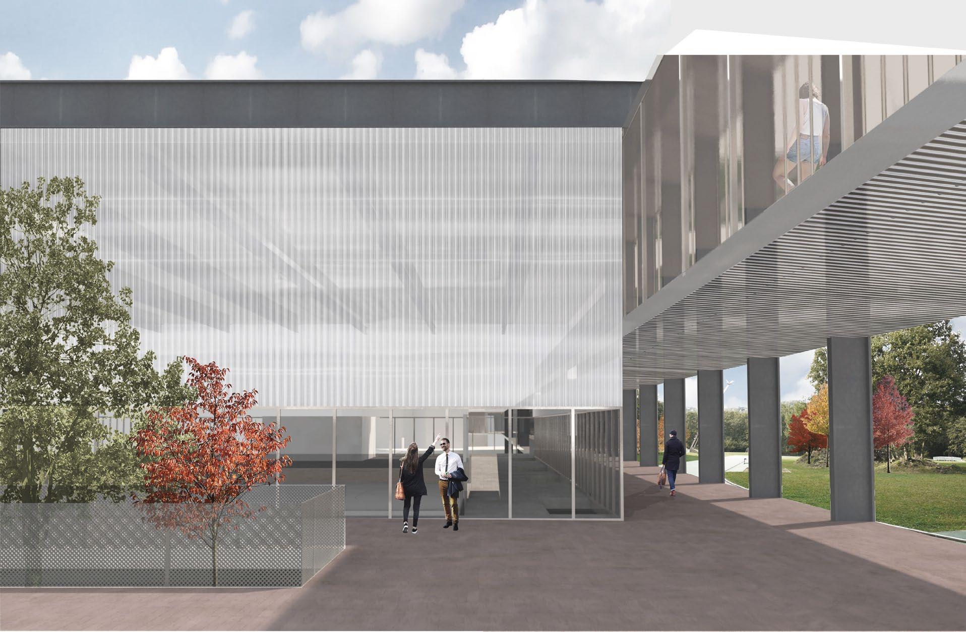 Des espaces paysagers qui recouvrent deux parkings souterrains de 350 places assurent le lien avec le reste du campus de l’université.