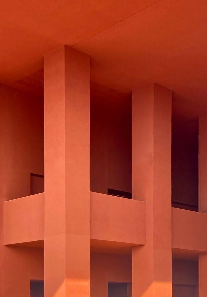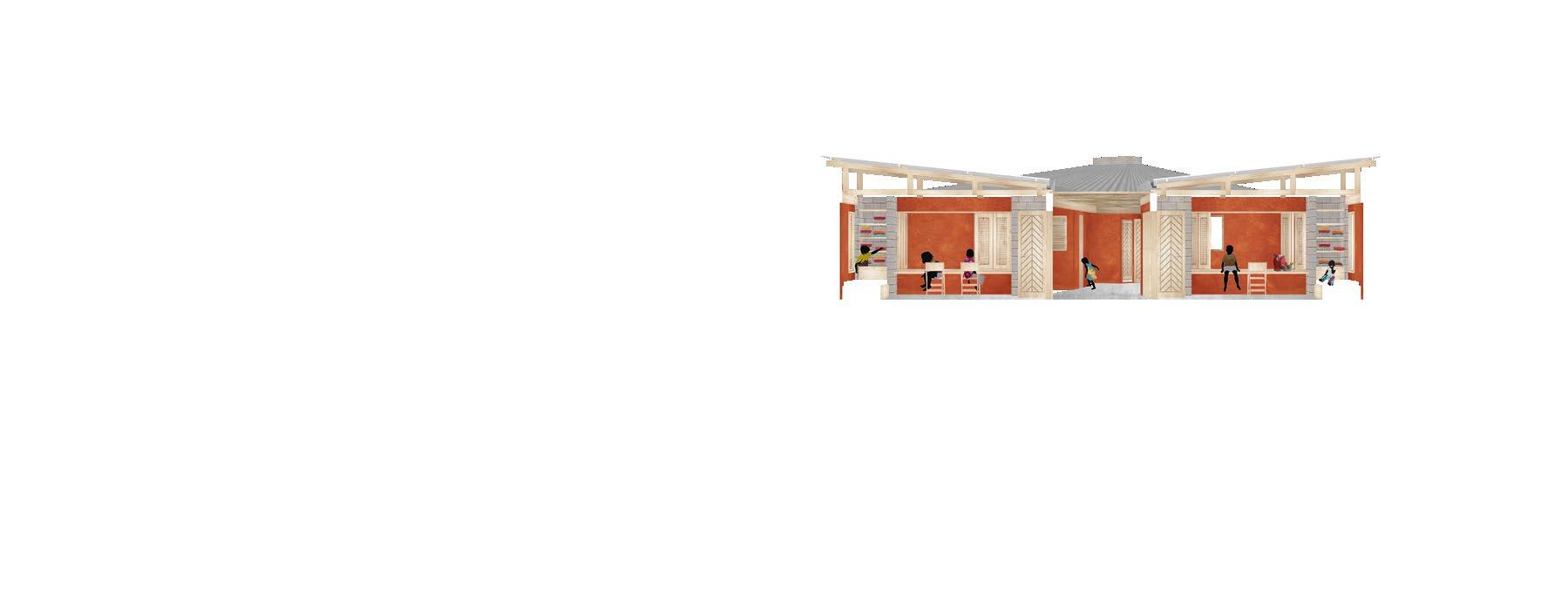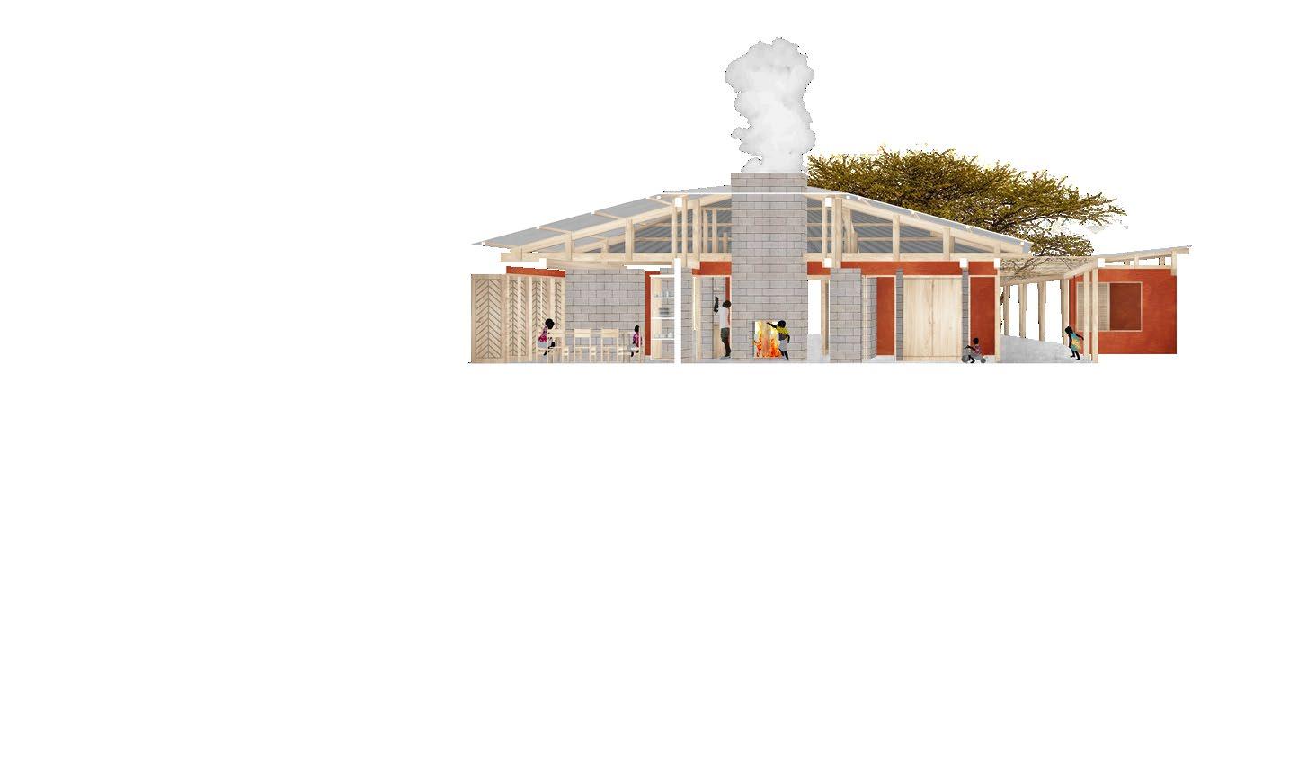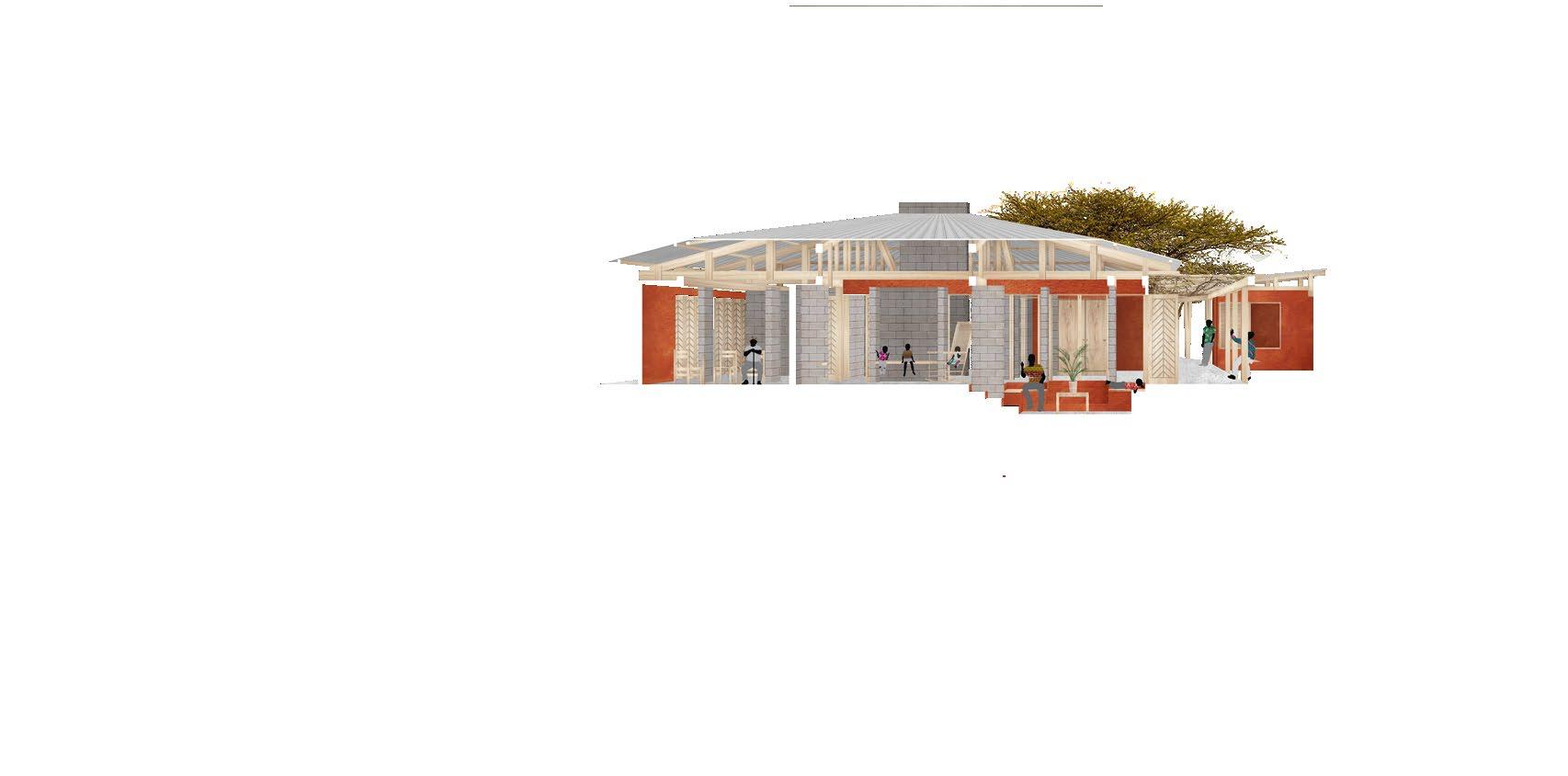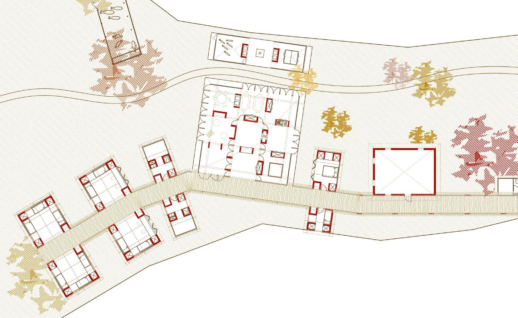 Le projet se compose d’un foyer rayonnant et de chambres dispersées atour d’un chemin couvert qui fait office de couloir mais surtout d’espaces interstitiels à investir pour les activités extérieures quotidiennes de la famille.