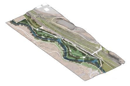 near the highway. As an ecological strategy to protect the biodiversity of the city, the team proposed to create floodable plaines which may be occupied during dry seasons. The axonometrics shown here depict a potential new flooding pattern at different intervals. The space remains open and accessible to the public with large spaces and elevated paths.