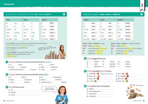 I riquadri di grammatica sono verdi e quelli di lessico e comunicazione sono lilla: i colori che identificano le sezioni di riferimento.