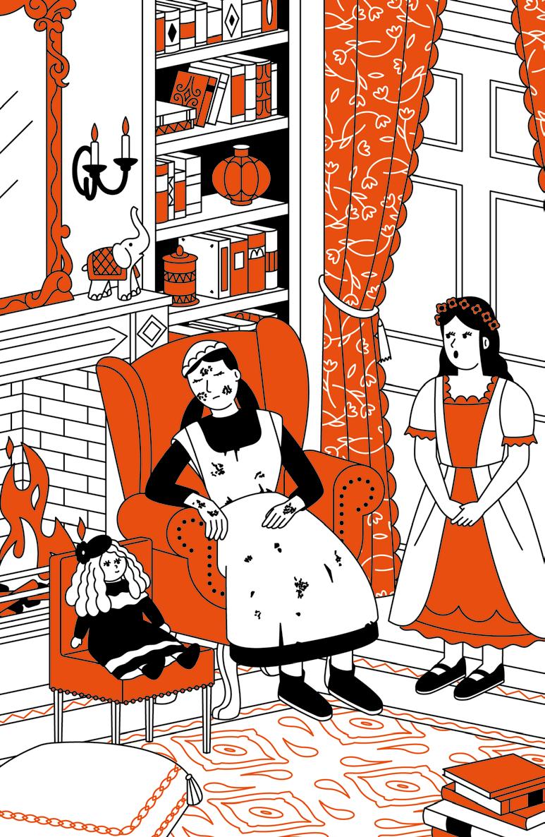 That night was Sara’s first time alone, away from her father, and her first night in her new bedroom. It was a very beautiful room, with a soft bed, a comfortable armchair and a rug* on the floor. There was a lovely desk with lots of books and things from India, and a big fireplace*. Sara felt very sad but she didn’t want to cry: I must be strong. I have Emily, my doll. Things will be okay. But I miss Papa!