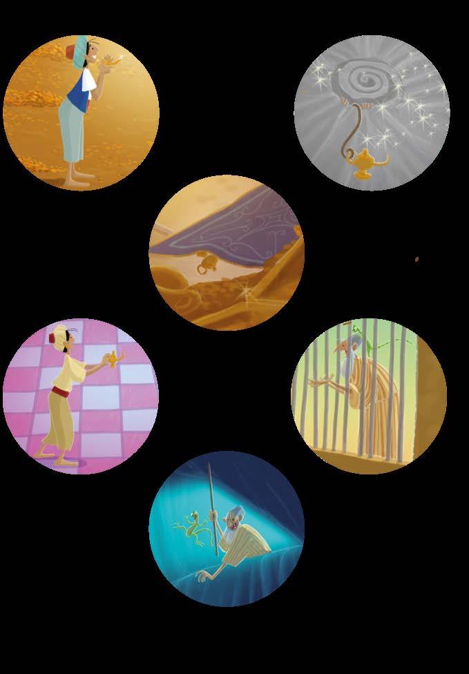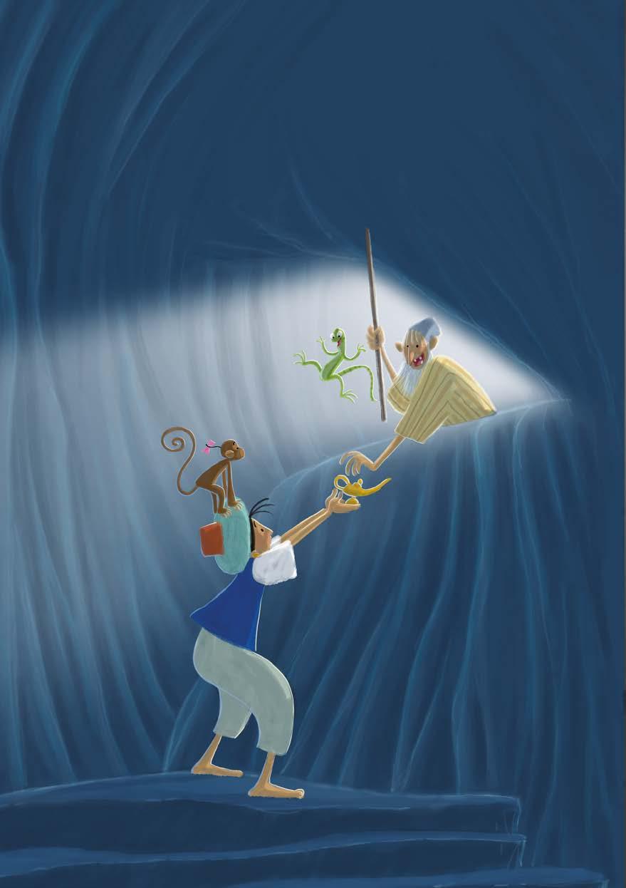 Einmal geht Aladin spazieren. Er sieht einen alten Mann mit einer Eidechse. Die Eidechse heißt Leila. Der alte Mann zeigt Aladin eine Höhle. In der Höhle steht eine alte Lampe. Bringst du sie mir bitte?