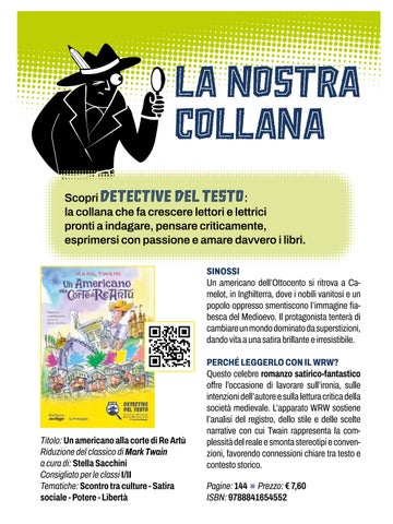 DETECTIVE DEL TESTO è la collana di narrativa che invita lettrici e lettori della scuola secondaria a vivere il Writing and Reading Workshop come un’indagine: ogni opera diventa un caso da approfondire, da interrogare con domande autentiche e indizi che stimolano un rapporto critico e personale con il testo. Ogni volume unisce una narrazione senza note, pensata per una lettura piena e autonoma, a pagine di taccuino che invitano a osservare, annotare e interpretare. Le minilesson �inali di lettura e scrittura offrono strategie chiare, esempi mirati e organizzatori gra�ici: tutti gli elementi chiave del WRW in un formato accessibile e immediato, da utilizzare in classe o a casa.