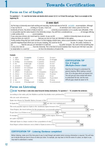 CERTIFICATION TIP Use of English (Multiple-choice cloze) .......................................... Read the text through to understand the general meaning. While reading a second time, fill in the gaps which are easiest first. This will give you more context with which to understand the text, and the more difficult gaps should be easier to fill.