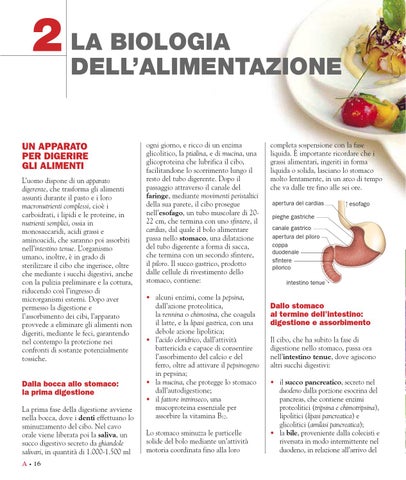 Dalla bocca allo stomaco: la prima digestione La prima fase della digestione avviene nella bocca, dove i denti effettuano lo sminuzzamento del cibo. Nel cavo orale viene liberata poi la saliva, un succo digestivo secreto da ghiandole salivari, in quantità di 1.000-1.500 ml A • 16
