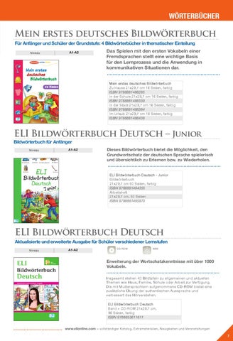 Dieses Bildwörterbuch bietet die Möglichkeit, den Grundwortschatz der deutschen Sprache spielerisch und übersichtlich zu Erlernen bzw. zu Wiederholen. ELI Bildwörterbuch Deutsch - Junior Bildwörterbuch 21x29,7 cm 80 Seiten, farbig ISBN 9788881484355 Arbeitsheft 21x29,7 cm, 80 Seiten ISBN 9788881485970
