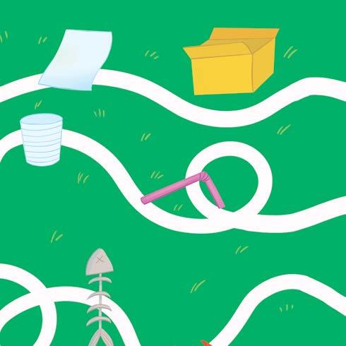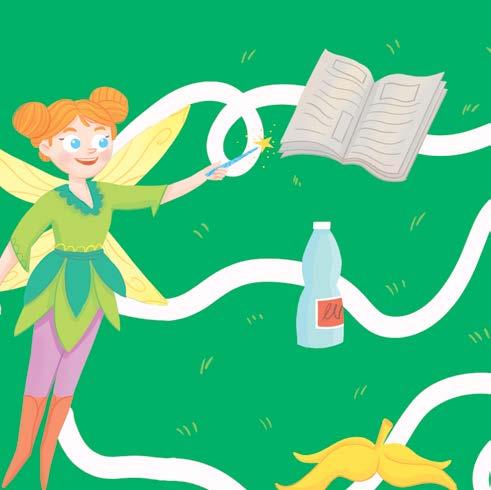 AIUTA LA FATINA A RACCOGLIERE I RIFIUTI E A GETTARLI NEI CONTENITORI. POI SCRIVI CHE COSA CONTIENE CIASCUN CONTENITORE.
